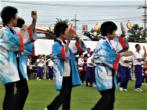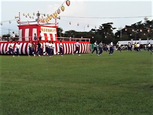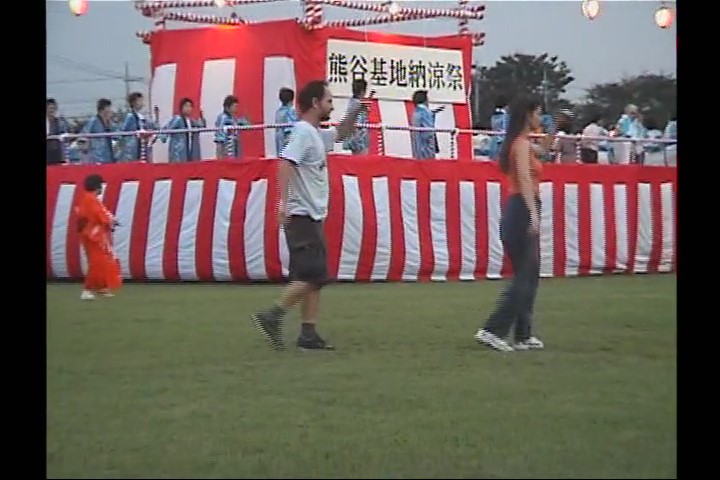 Tonight the base was opening its doors for a Bon Dance, a festival held in conjunction with Obon. (Festival of the Dead) This celebration started out as a Buddhist ceremony to cheer the spirits of the departed, but nowadays much of its religious character seems to have given way to an atmosphere of merrymaking. Traditional music and dance appeared alongside more contemporary hokey-pokey type dancing to such songs as the American pop hit “Beautiful Sunday”, with lyrics in both Japanese and English. The logo of the JASDF, by the way, was displayed consistently in English.