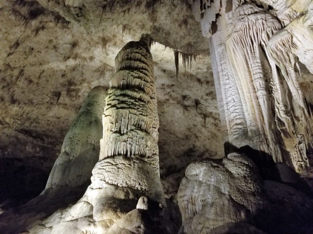 It was a chilly day in New Mexico with even a few snow flurries, but we didn’t mind because we were taking refuge with the bats hundreds of feet below the earth’s surface at Carlsbad Caverns. We spent a couple of hours making the big loop through all of the caverns that are open to the public, seeing some unbelievable stalagmites, stalactites and other speleothems (cave formations). Many of them have been given names like The Whale’s Mouth, because of what they resemble. Others are as yet unnamed, so you can come up with your own. (We claim the rights to Garfield, because one formation looked like the famous cartoon cat.)