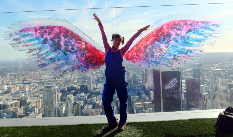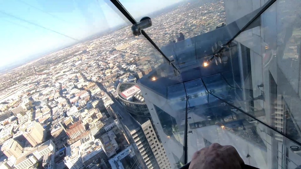 We then walked all the way downtown to visit OUE Skyspace, which is at the top of a landmark skyscraper (the one the aliens land on in Independence Day). Not only does this place have an excellent vantage point for a view of L.A., and some exhibits about the city’s entertainment history, it also has the Skyslide: a 45-foot glass slide that takes you on the outside of the building . You can’t exactly do that everywhere!
