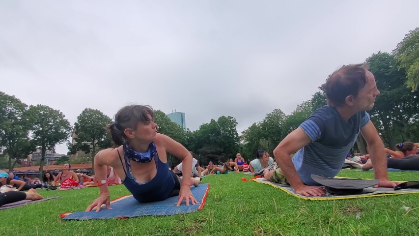 Wanderlust is a triathlon, but a very unusual one. The first part of the event consists of a 5k run, which is not so unusual. But the other two parts consist of yoga and meditation. And all around there are booths of various vendors giving out free samples of their wares. These included food and beverage, and many other items. At one booth, we each had custom bath salts mixed to our specifications. (We’ll have to wait until later to try them out, though.)