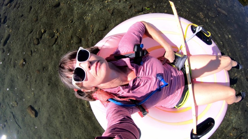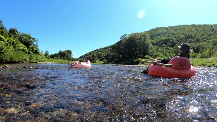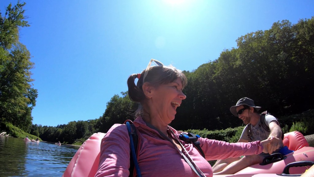 At Vermont River Tubing, near Stockbridge, we put our inner tubes (actually they were more like giant rubber duckies) into the water, along with three other adventurers who are locals, but had never done the tubing here before. They had a great sense of humor and made the expedition more fun, despite the frustration of getting caught up on the rocks so often. We finally decided we had to cheat a little bit; we all picked up sticks to propel ourselves from the bottom a la Huck Finn. The float took about twice as long as estimated. But hey, that’s what lazy rivers at the end of summer are for. Fortunately, we were near the finish line when Kimberly’s tube sprang a leak.