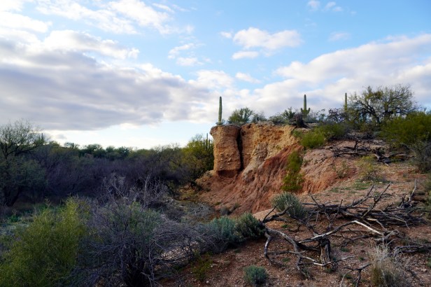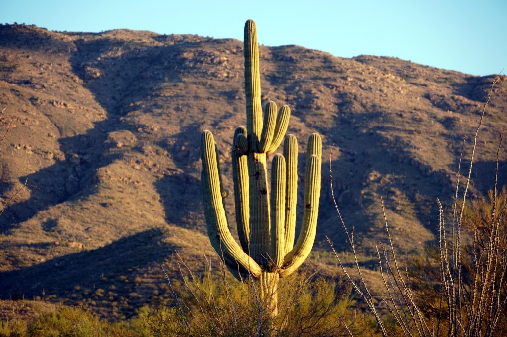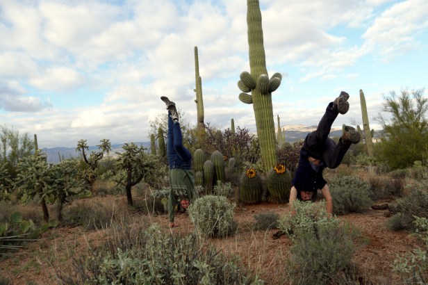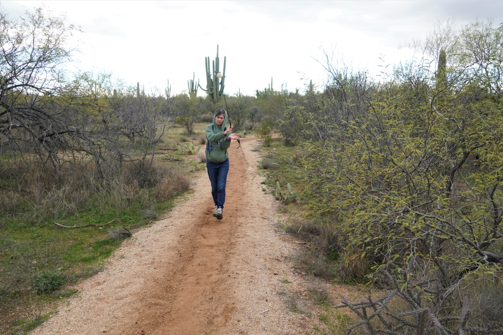 It was quite an eventful two days in the Tuscon area, beginning yesterday with a 3-hour hike through Saguaro National Park (East). Saguaro, of course, is a type of cactus, the iconic cowboy-and-cartoon cactus that sometimes looks as if it’s holding up its arms during a holdup and sometimes looks as if it’s conducting desert traffic, but is always intriguing. We saw a variety of desert vegetation, and Kimberly took advantage of the open spaces to get in some practice with her poi balls. We were even there for a postcard desert sunset.