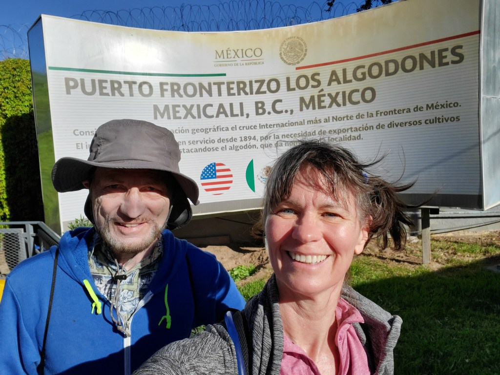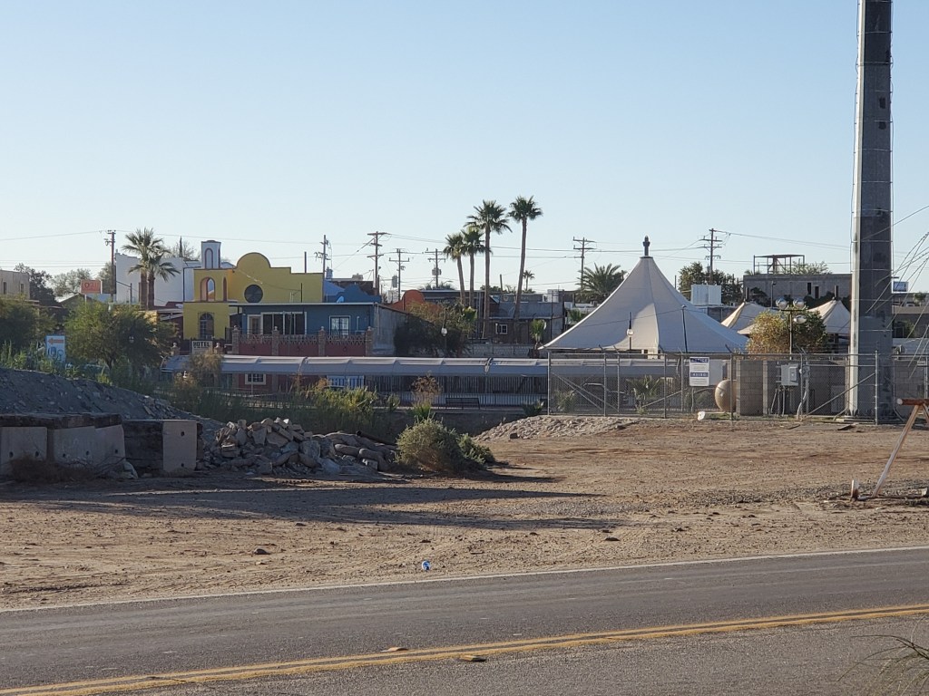 The border crossing is in a little stretch of desert about 5 miles outside of Yuma. About the only thing around is a casino (and a rather nice one) operated by the Quechan tribe, which owns the land thereabouts. The tribe maintains a parking lot next to the border with a parking rate of 6 dollars (higher, of course, for gargantuan rides like our RV and trailer). Once upon a time, there was even a campground next to the parking lot, but it’s now defunct. RV owners also can park in a lot at the casino, or on the surrounding reservation land, and spend the night for 10 dollars. This is what we opted for, and then we walked to the border, a distance of about a mile and a half.