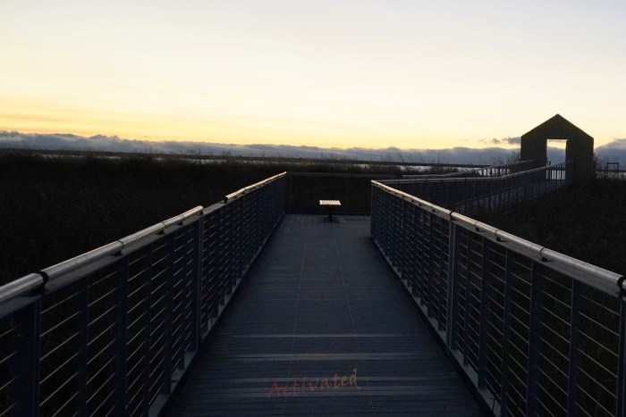 And then there were all of the birds that call the marina home. Swans, egrets, terns, oodles of pigeons and many others that we are learning to identify. All fascinating to watch. Top that off with the setting sun casting a symphony of colors and perhaps you can understand why reading signs about the trail closing a certain times was not a top priority nor was it even seemingly relevant to make a note of trail lengths.