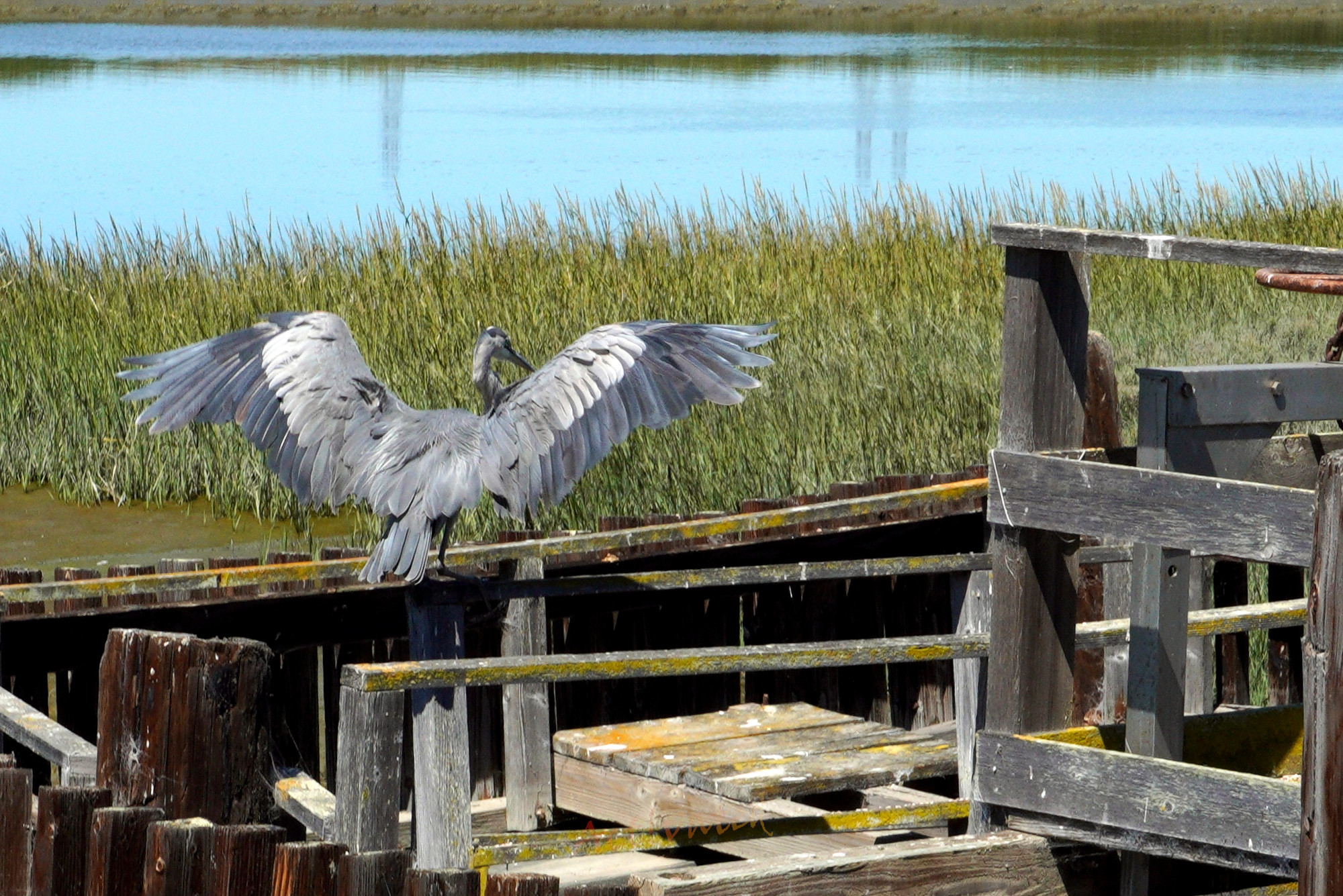 The next day, she talked Dennis into joining her on an early morning stroll. We both spied the manta ray and were greeted by a blue heron who happily posed for the camera, unlike the elusive manta ray. And screamed at by the territorial Forster’s Terns.