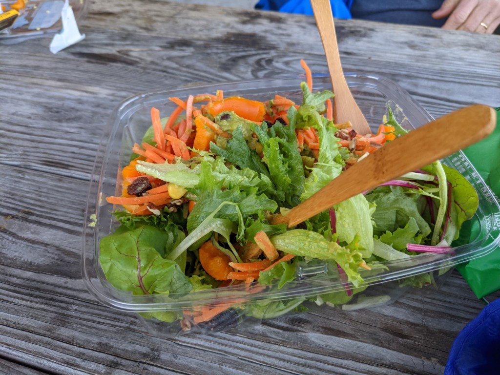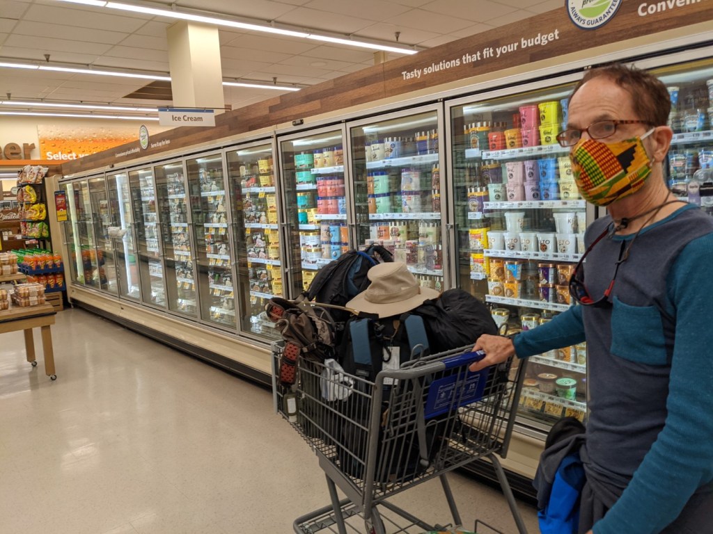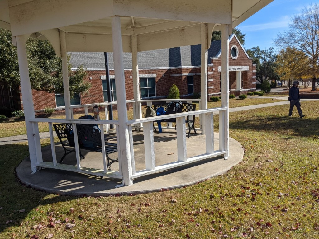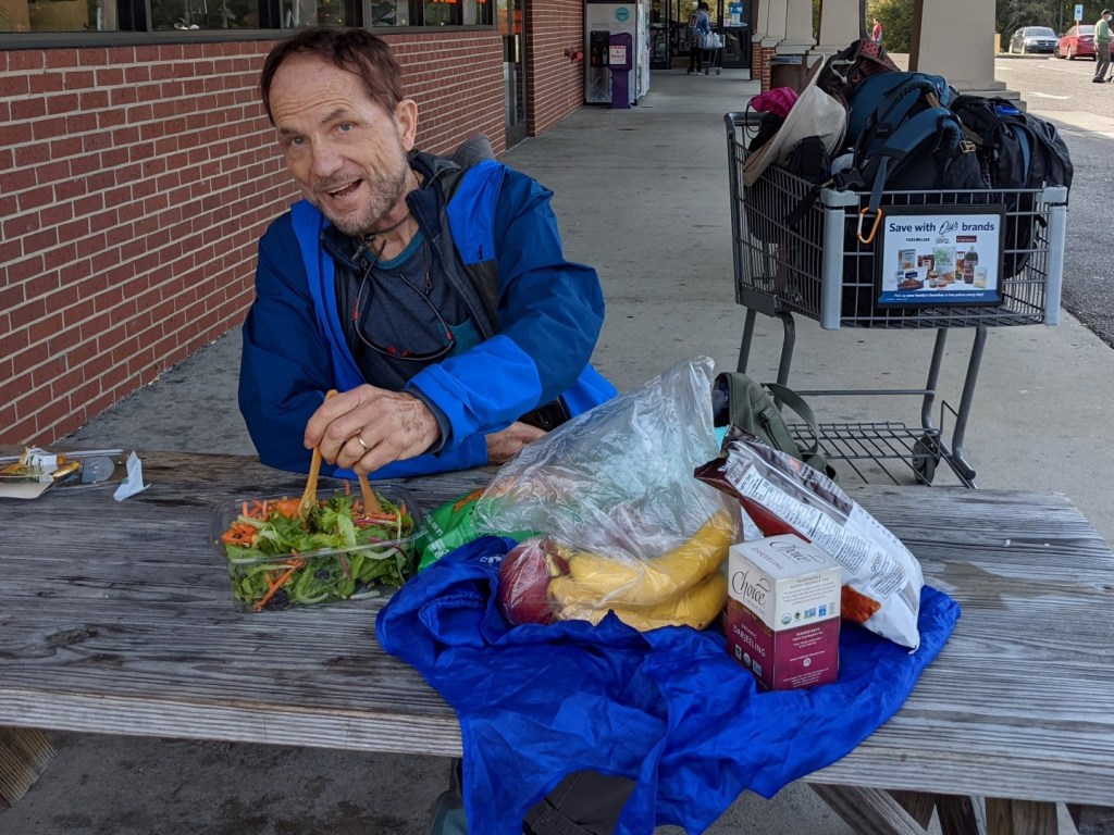 Meandering along in no hurry to get anywhere, we stumbled upon the library, knowing it would be closed. But we spied a gazebo, unearthed an outlet to plug in our computers, found the password for the WiFi posted on the door, and burrowed in for a while. All we were missing was a bathroom. After a couple of hours we donned our backpacks and impersonated turtles, hiking with our homes on our backs a mile to use the restroom at a fast food restaurant — and then on to a supermarket to scare up something for dinner and stock up for the trip.