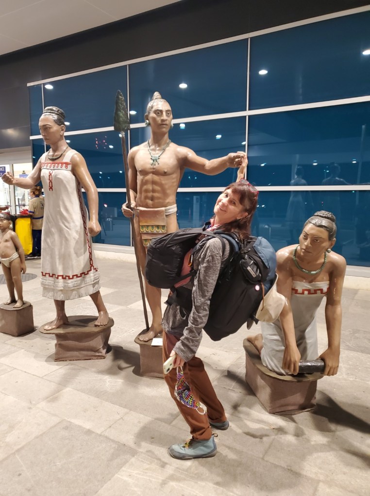 Boarding another Volaris plane, we were whisked away to Merida, where we landed about 90 minutes later, at 8:30 p.m. (Loved the sculptures in front of the airport depicting traditional culture of the region.) Had it been a few hours earlier, we might have just walked to our hostel, as it’s only a couple of miles away. But we didn’t want to check in at an ungodly hour, particularly since we were already a bit tired. So we tried bringing in an Uber to the rescue.