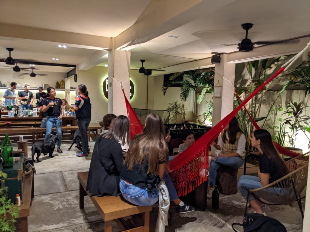 The hostel is a wonderful old building across the street from a little park — in which there was still some activity going on. In fact, the hostel itself was hopping; there was a special party transpiring in the downstairs common area, and we were assured that the joint wouldn’t always be this lively. The common area, which includes the kitchen and dining tables as well as coffee tables, foosball, hammocks and a miniscule pool, is actually a courtyard partially covered by a roof.