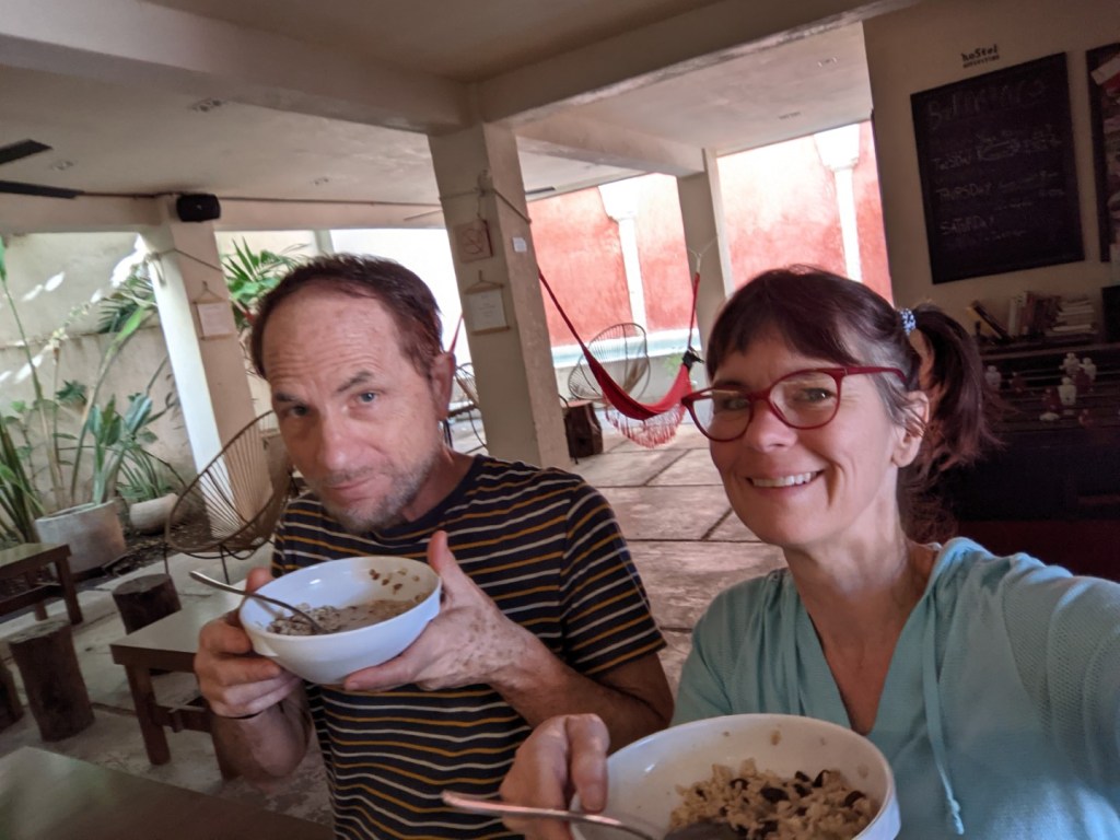 Despite the size of the store, the selection was not what we are accustom to back in the United States. The produce offered is limited to only what is in season. But we did manage to obtain oatmeal, beans, whole wheat tortillas, nuts, raisins, prunes, apples, bananas, quinoa, carrots, tomato sauce, and even decaf coffee and cashew “milk”. Plus an intriguing dried fruit (we later learned it was blueberries) seasoned with chilis that were quite tasty. But we could not find certain other items we wanted, including sunglasses. But Dennis did find a short-sleeved shirt he liked — which he needed, since he only brought one on the trip — for only 68 pesos ($3.13).