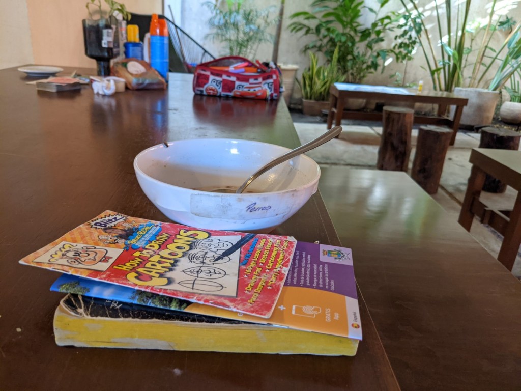 This morning in preparing our own breakfast, we took a couple of bowls from the shelf, including one that was set apart from the others. Dennis used that one to heat water in the microwave for making our oatmeal, and then eating his own oatmeal out of it. It was only after he had eaten about half of it that he noticed the small and rather inconspicuous label on it: “perros”, meaning dogs. Ah well, at least the microwaving probably killed any canine cooties.
