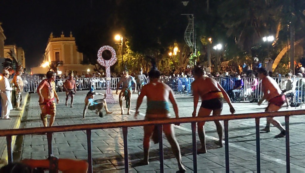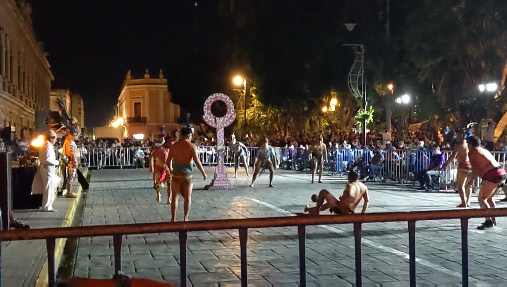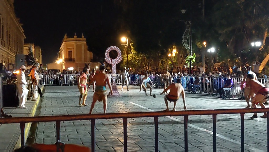In the evening, we walked into the heart of town, about a mile away, to witness a most unusual spectacle: the re-creation of a match of Pok Ta Pok, a ball game that was played by the ancient Mayans. It was played with a ball of solid rubber that — according to traditional reports — players manipulated with the hip and tried to knock through a hoop about 10 to 15 feet high. Supposedly, the captain of the winning team had the honor of being sacrificed to the gods.