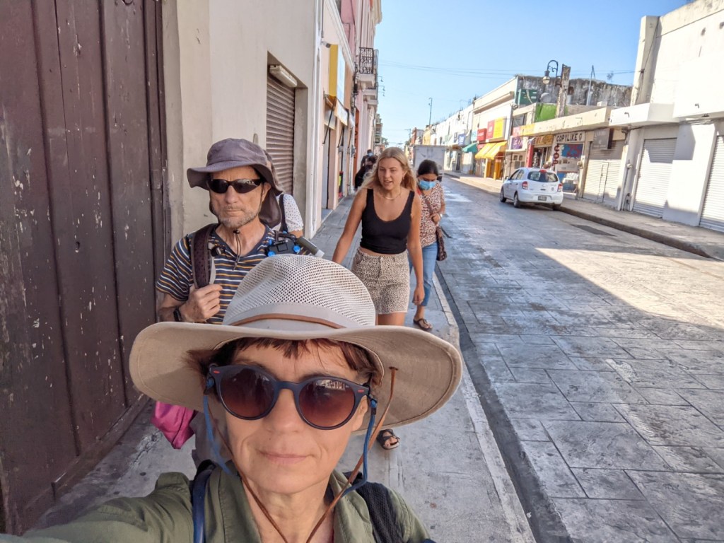 Back at the hostel, we had what might be called our Thanksgiving family get-together. It was our first time ever to meet Kimberly’s cousin Daniel, who’s lived in Merida for years — that was the main thing, in fact, that prompted our decision to come here. Daniel, the son of Kimberly’s birth mother’s brother, recently battled COVID-19, and a serious infection that left him hanging by a thread for several days. Finally, he’s recovering, and was able to meet up with us, along with his wife Debi.