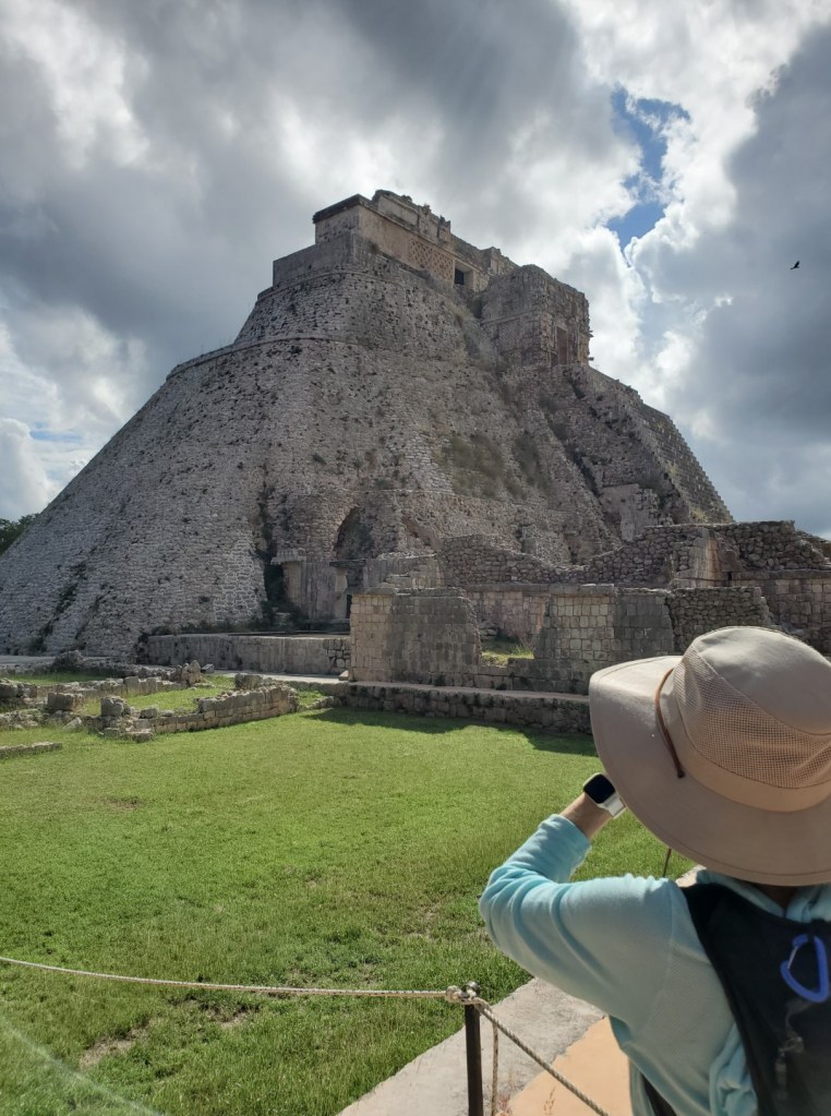 Uxmal, designated a UNESCO World Heritage Site in 1996, has a great deal of mystery surrounding it. It was once a city occupied by as many as some 15,000 inhabits, though their exact dates of occupation, and the construction dates of the buildings are unclear; but apparently construction was in several phases and was completed by about 1100. As the guide on our walking tour of Merida mentioned a few days ago, most of the Mayan records were destroyed when an overzealous priest decided to burn nearly all of their books (codices). As a result, an unknown body of knowledge was lost, including perhaps folk annals and useful medical knowledge. The Mayan Uber driver we had a couple of days ago was able, at our request, to sing two Mayan songs; if the books had been preserved, he might have known songs much older.