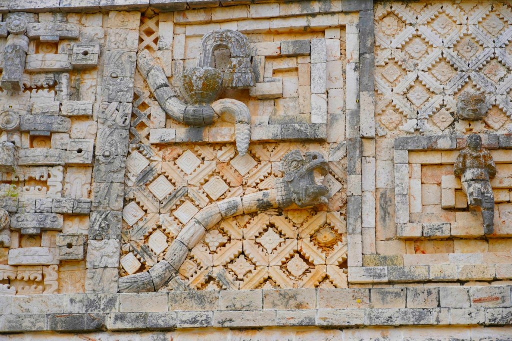 Walking around to the other side, you come to a large quadrangle that appears to have been a public forum. It’s surrounded by structures that remind you of a movie set of some kind or other, though you can’t quite name the movie. Look closely and you see motifs paying tribute to various animals — most notably the serpent, which was a symbol of good rather than evil in Mayan culture. It’s unknown just what many of these buildings were used for.