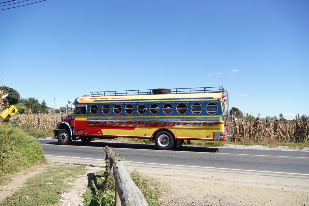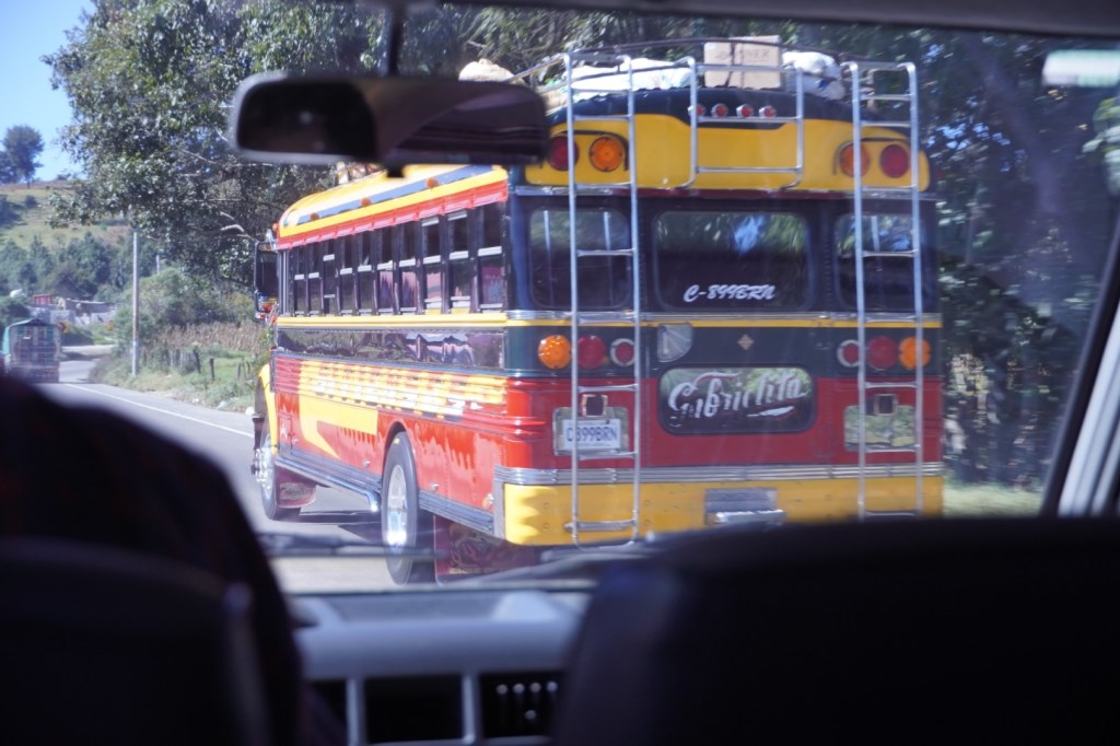 The flight to Guatemala City went without a hitch (well, except for the long wait at the Cancun airport in a temperature that was made us wish we’d brought our winter coats), and we landed at about 8:30, having gained an hour along the way. Meanwhile, we’d had to arrange transportation to Lake Atitlan. There are several options for the 4-hour trek, including taxi and tour bus (both out of our budget). There are also the legendary “chicken buses”, which are repurposed school buses from the U.S., colorfully painted in an almost hippie-ish fashion. They’re all over the place in many Latin American countries, and they’re incredibly cheap, but, they’re also rumored to be not the least bit comfortable. We considered taking one just for the experience, but the best choice for us seemed to be a collectivo:, which is a shared shuttle.