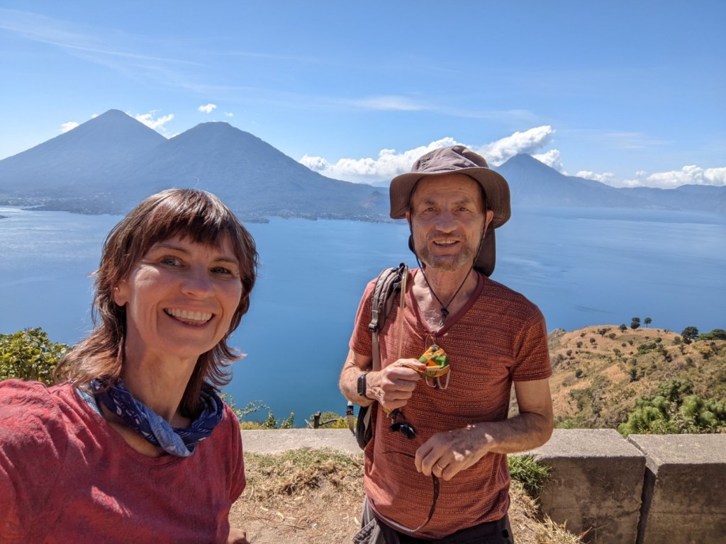 Not much longer afterward, we pulled into the lakeside town of Panajachel, our terminus. Melvin dropped us in a parking lot, and we paid him 400 quetzales (52 dollars). Then we walked across the street to a grocery store that we’d had recommended online. It had a fair selection of food, though we were disappointed by what it didn’t have (e.g., tea decaf coffee and sunscreen). But it did have packets of refried beans at a very low price, and a huge thick bar of local chocolate that was also reasonably priced and — as it turned out, heavenly tasty. After leaving there, we passed a health food store that looked promising. It also had a few items that we welcomed, though its selection was also incomplete — and a bit expensive for Guatemala.