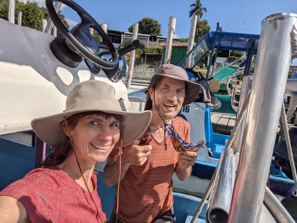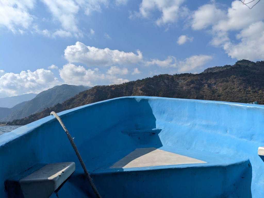 Panajachel (commonly called Pana — probably because we outlanders have such a difficult time pronouncing it), one of the largest and most developed towns on the lake, is a major transportation hub for boats, buses, shuttles, chicken buses, and what have you. We walked down to the dock to catch a boat to Santa Cruz. It’s never hard to find the right boat at these docks, because as soon as you get within a block, you’ll be approached by men (or more often, young boys) asking you where you want to go, and pointing you to the right boat. There are both public and private water taxis, and there seems to be little difference in service or price. Generally. But if you’re a foreigner, and especially if you’re a gringo, you can expect to pay higher fares than the locals — and depending on the pilot, they can be quite a bit higher. As we learned on our very first ride. While the residents paid 10 quetzales each, tourists usually pay 15; but our pilot stuck it to us for 25! After you’ve been here a few days, you learn which boats to avoid. (Subsequent excursions of this length set us back 15 or 20 quetzales each, and on one occasion we paid only 10.)