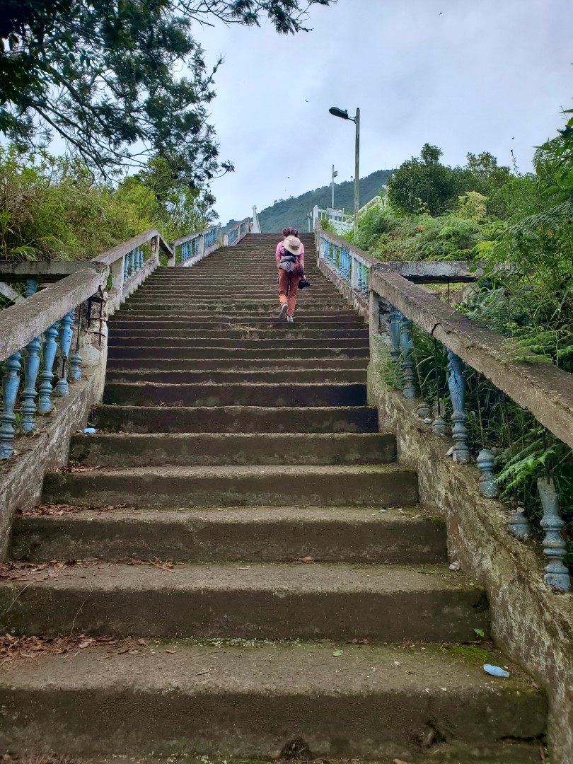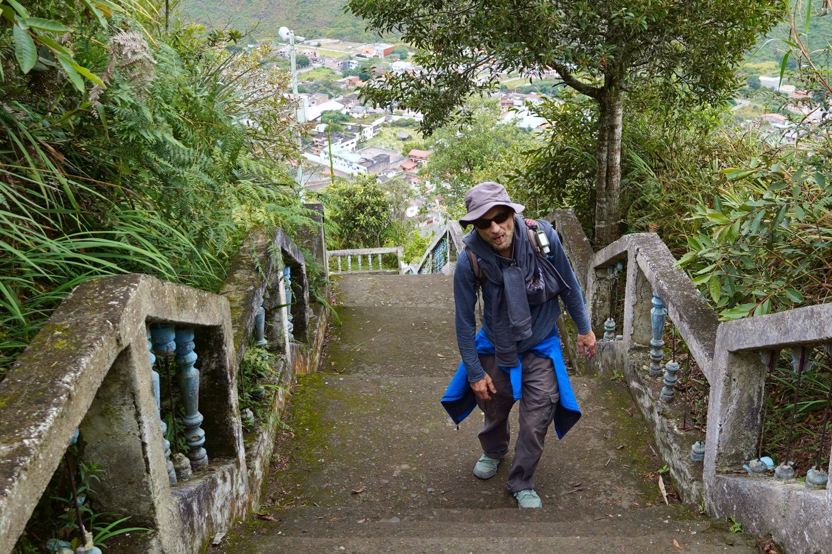 Except we grossly underestimated the strenuousness of the ascent, and the length of time required. After about an hour and a half of going up steps, and up and up and up, we were zonked; and looking at Google Maps, we realized we’d made it only about a quarter of the way. So we turned back, figuring we could take some means of transportation other than shoes to the peak on some other occasion. (Spoiler alert. It happened the following weekend.)