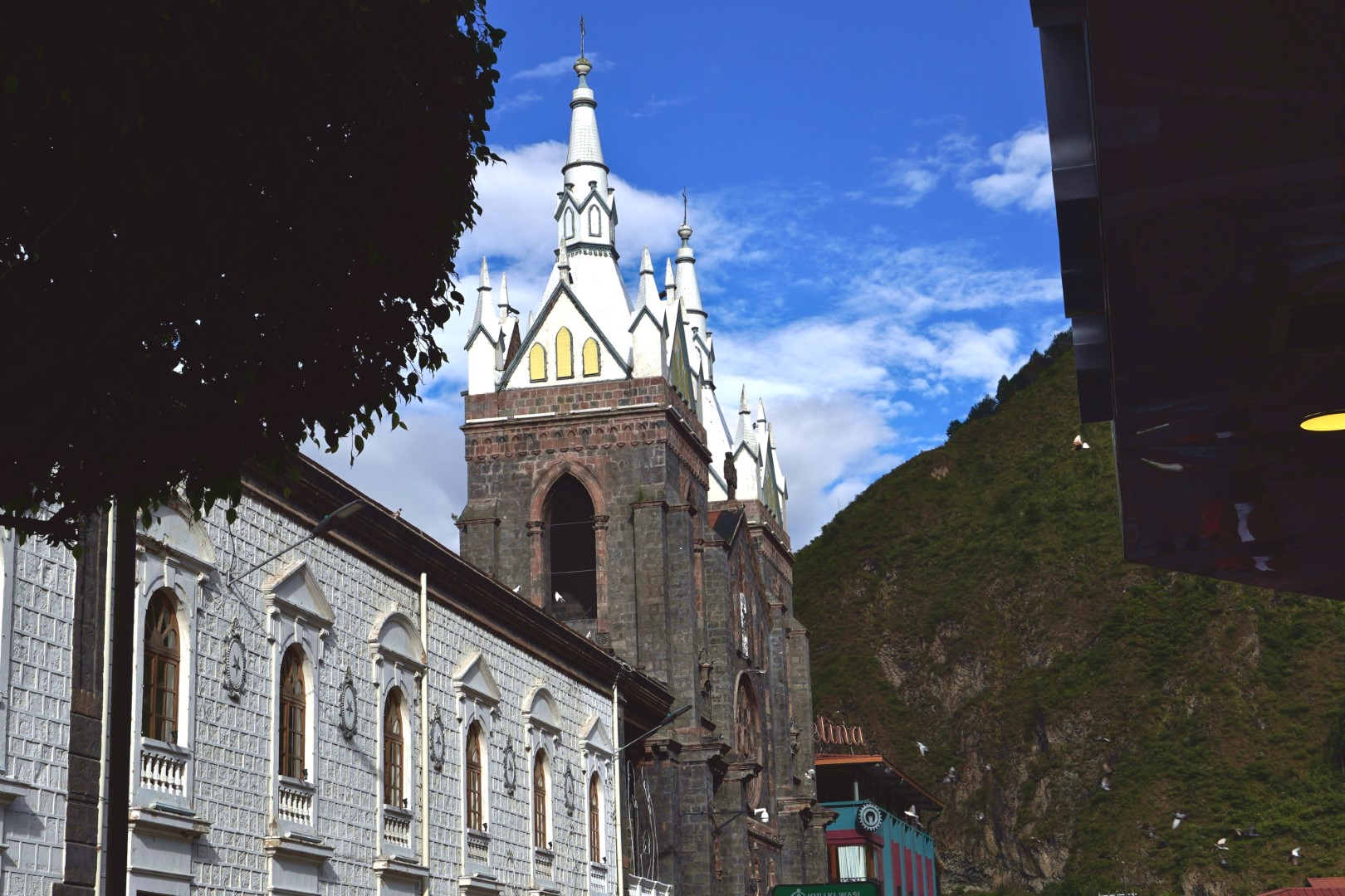 After unloading our gear, we began perambulating about town, and quickly saw that Baños was every bit as alluring as our students indicated. The streets were abuzz with vendors, and all kinds of little shops, and tour companies. There was a huge, majestic cathedral, and a chocolate factory that offered tours (including the opportunity to make your own chocolate), many restaurants, cafes and bars — many of them evidently catering to foreigners.