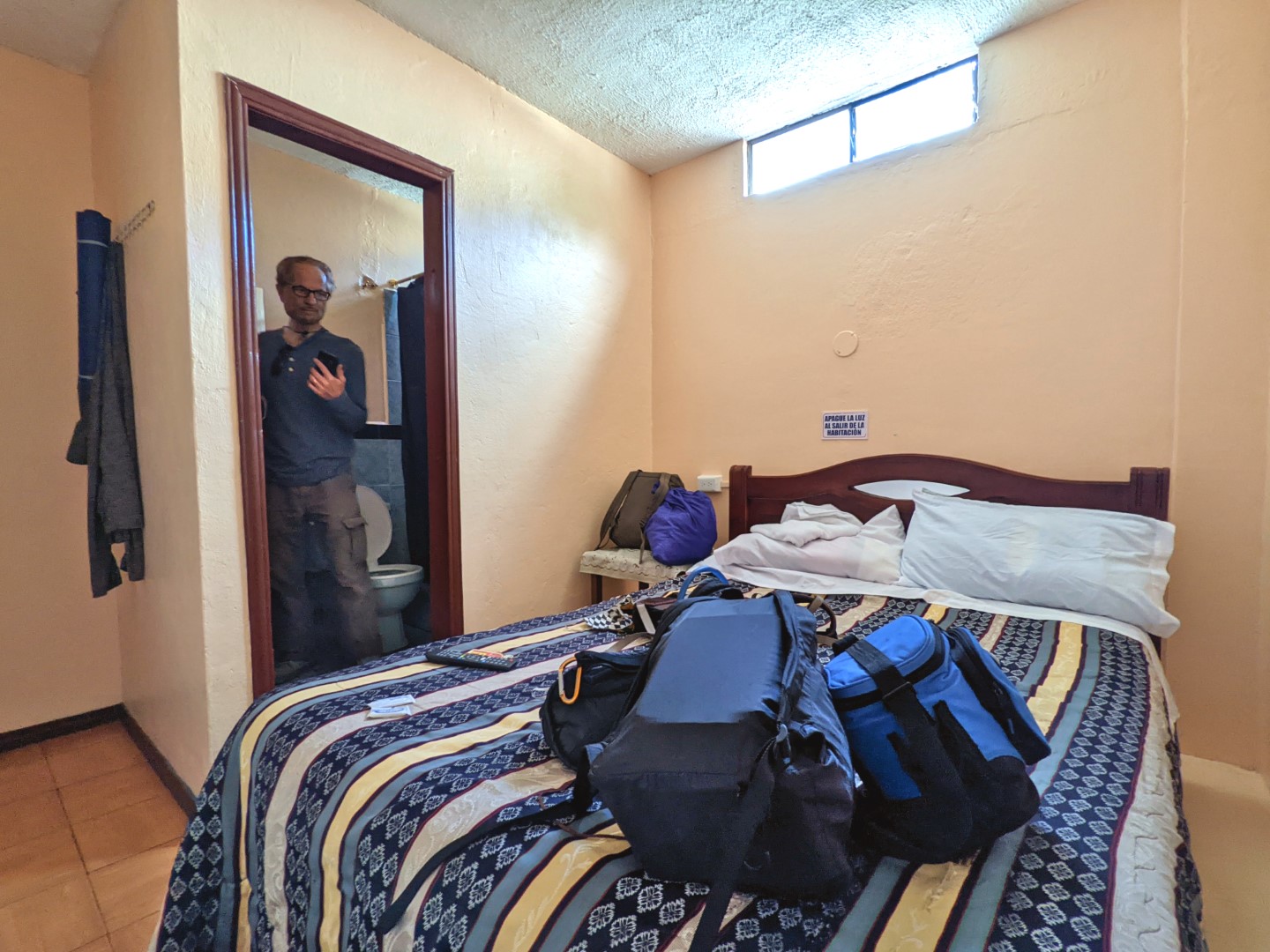 There were a number of excellent coffee shops, serving not only outstanding decaf coffee, but pretty good tea. And at very reasonable prices — as little as a buck. But the strange thing is, none of them opened until 8:00 a.m., no matter the day of the week. Either the folks in this town aren’t accustomed to waking up to a jolt of caffeine, or they just wake up earlier — at least the baristas do. Somebody needs to teach them the real meaning of agua santa. So Dennis had to twiddle his thumbs for a couple of hours in the morning before getting his daily tea fix. We couldn’t make tea, or cook, in the hostel as we would have preferred, because we didn’t have a kitchen. So we again had to draw upon our skills as cold “cooks”, assembling meals from whatever ingredients we could get from the store that didn’t require heating.