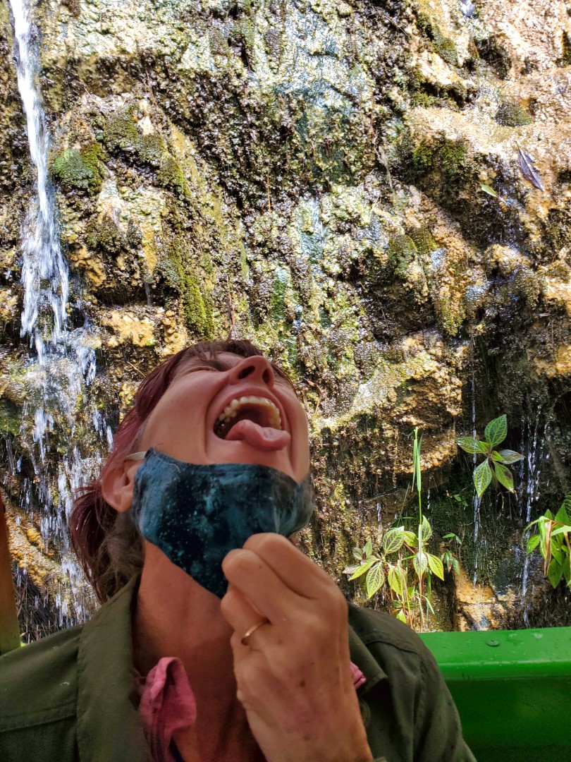 Then we boarded our chiva and headed out to see the waterfall among waterfalls. It was only about 15 miles away, but we made several stops en route, to look at other waterfalls, to be splashed by a small cascade that pummeled our vehicle, and to note a big boulder that supposedly looked like a profile of Jesus (any rock, of course, looks like the face of somebody or other if you look at it long enough and from the right angle). And there was a stop at a candy factory, where we were given a little tour of a candy-making process, and given free samples of both a fruit-flavored confection and a fruit liqueur (both quite interesting.) There was the hope, of course, that we’d purchase items in the gift shop, and many passengers (from our own chiva and others) did so. These stops explain why the fare was so low — the tour company receives kickbacks from these businesses along the way.