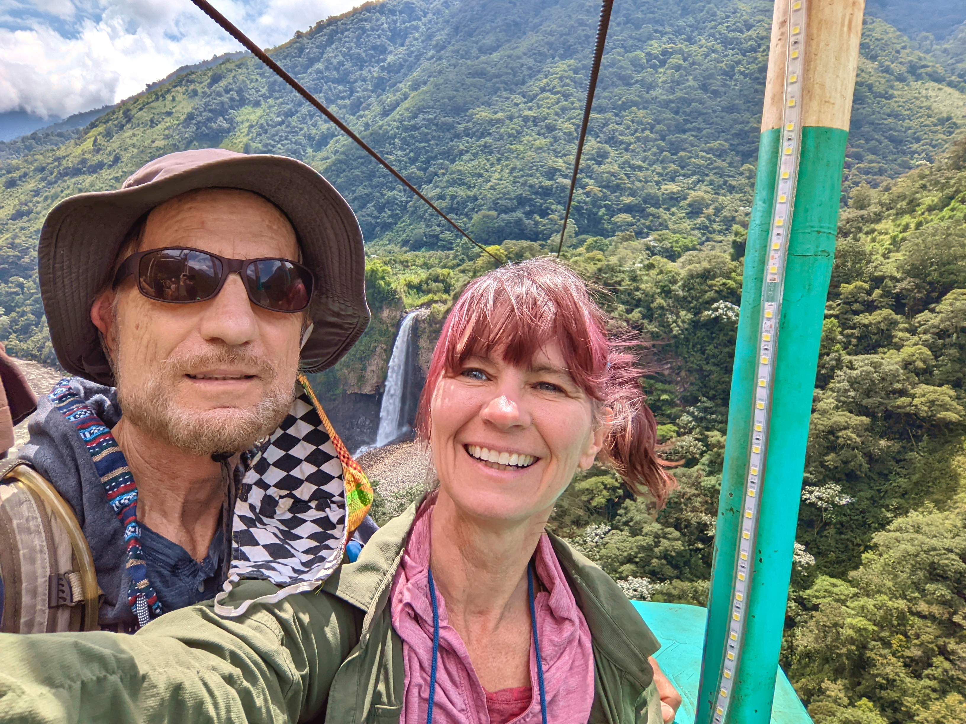 One of them was a little cliffside thrill ride establishment that included zip lines. Being major zipline devotees, we seriously considered indulging ourselves on it — we were particularly enticed by the offered option of riding it while hanging upside down. But we decided to pass this time, since we didn’t know how much more money we’d have to fork over somewhere down the road. We did, however, pony up a smaller sum for a sort of cable car ride across the deep canyon, not far from yet another impressive waterfall.