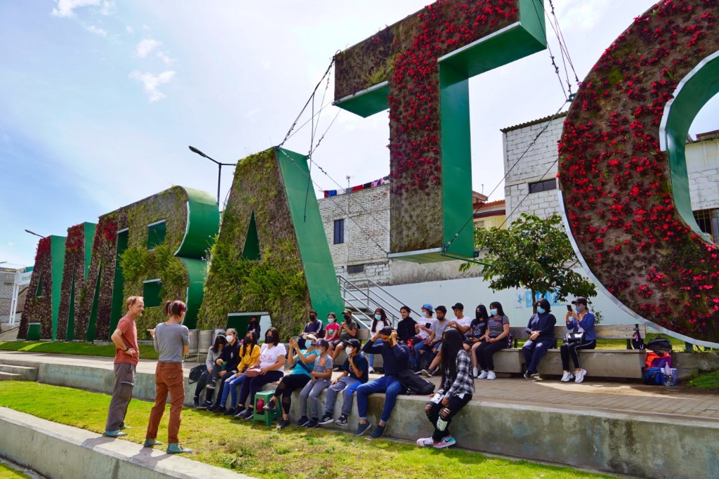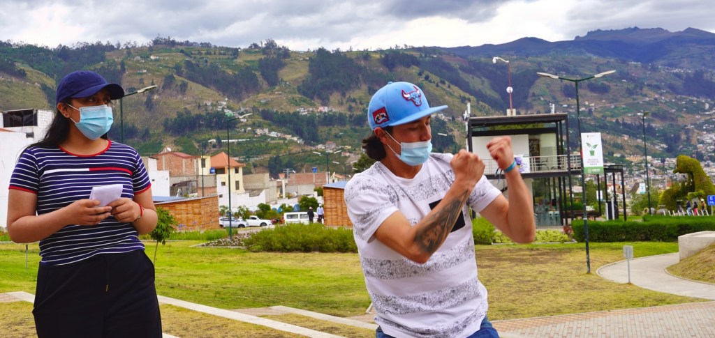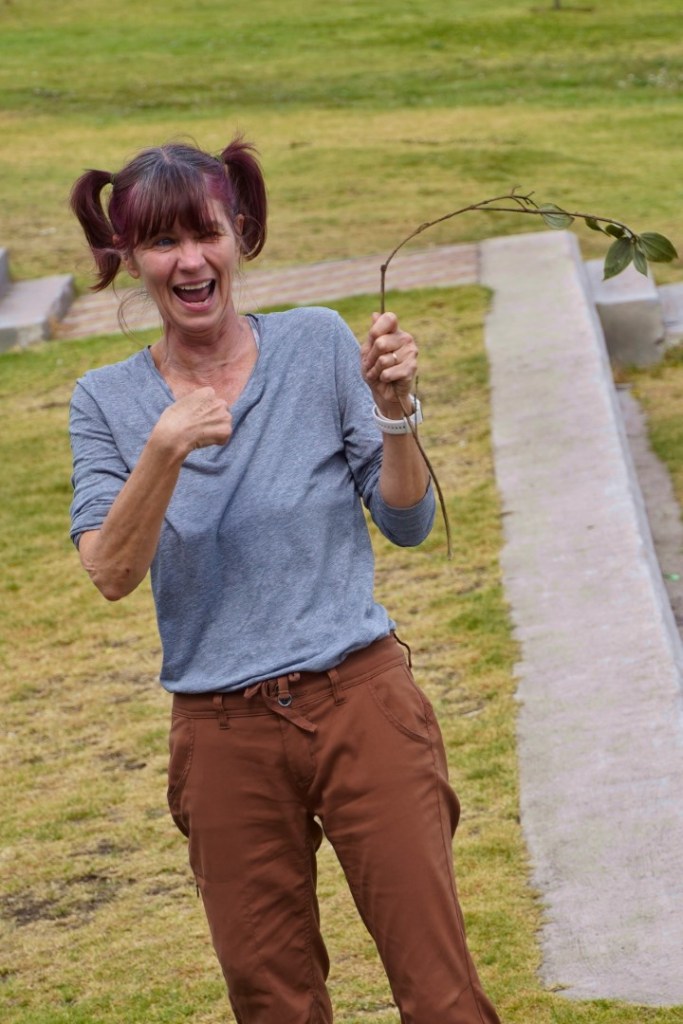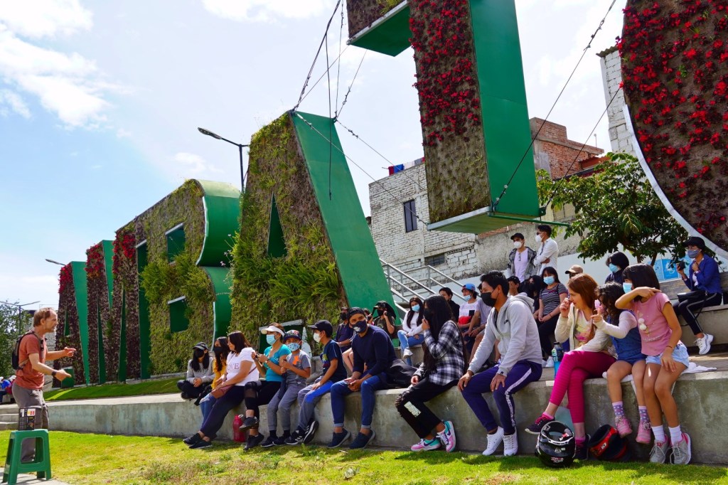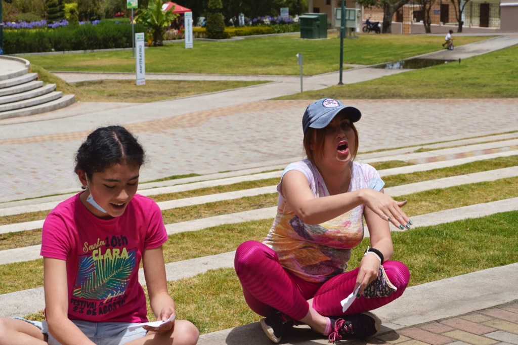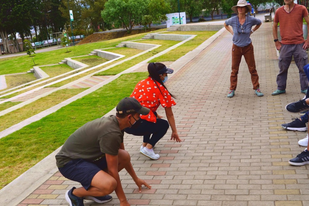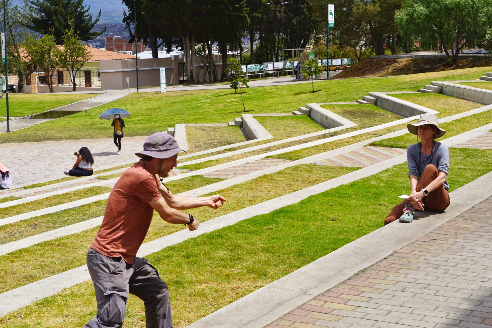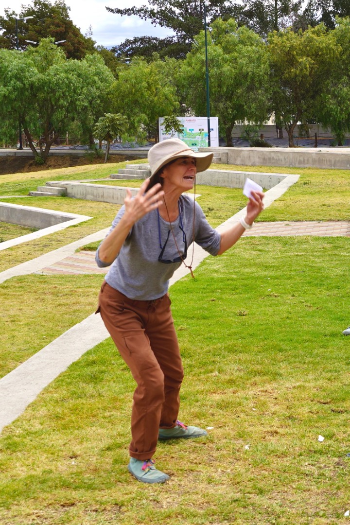 So the big day came, and we headed to the local park, Parque de las Flores, with the only props we would need: a stool borrowed from the school, a crudely homemade sign with an arrow (pointing in the direction of the racecourse the Tortoise and Hare followed), a bottle of “glue” (a.k.a. a TSA approved travel-sized bottle of sunscreen) and a jump rope. But since no jump ropes were readily available we hastily fashioned one out of our clothes line and a couple of shoelaces that we have squirreled away in our backpacks. The tree branch we figured we could find on site. There were already quite a few locals in the park, including some engaged in group activities. But we staked out what was probably the best available venue: the steps in front of the huge Ambato sign. Certainly not ideal, but also certainly not the worst place we’d ever performed.