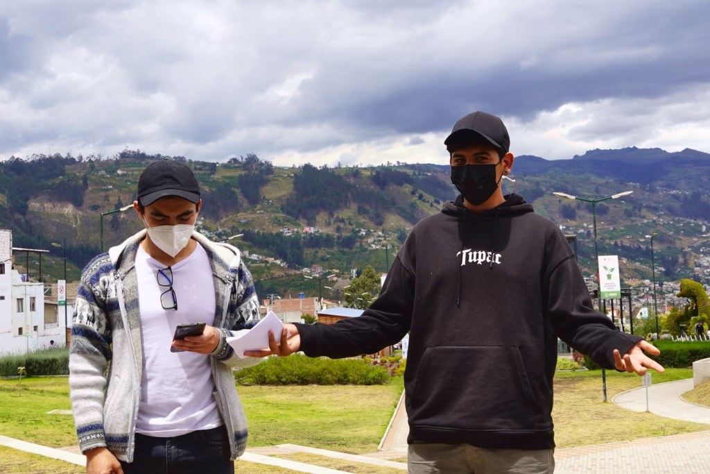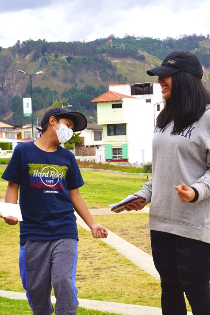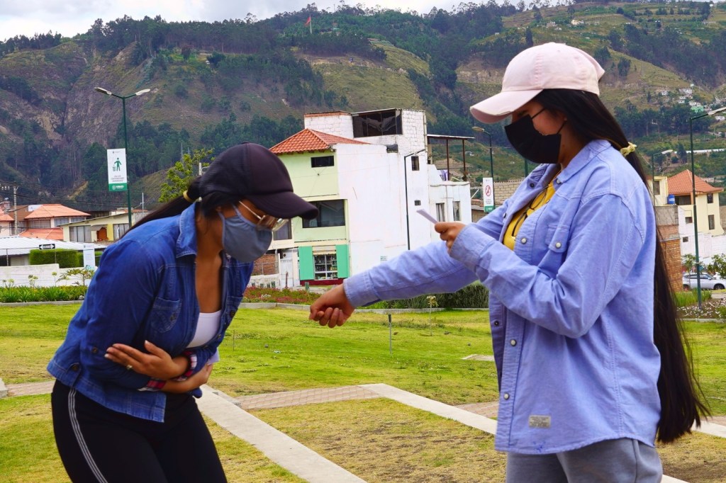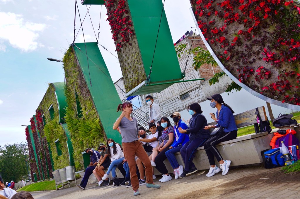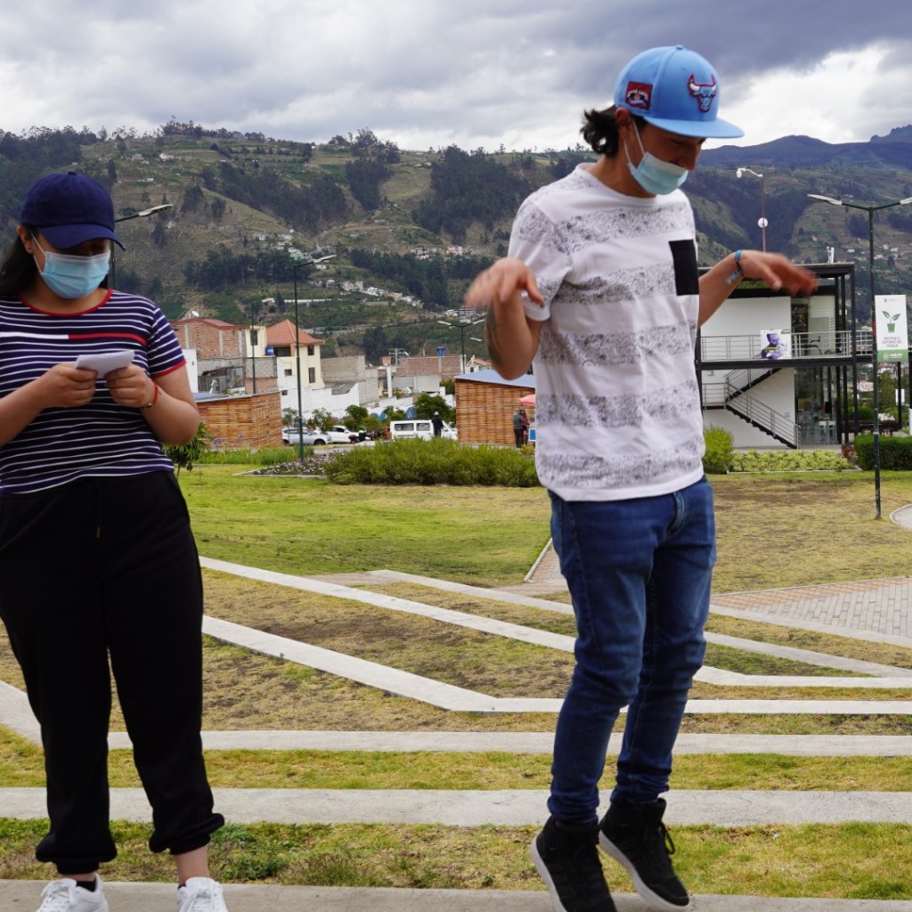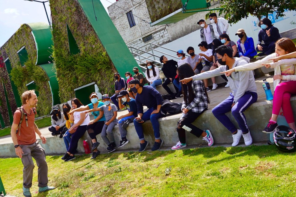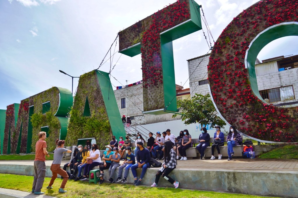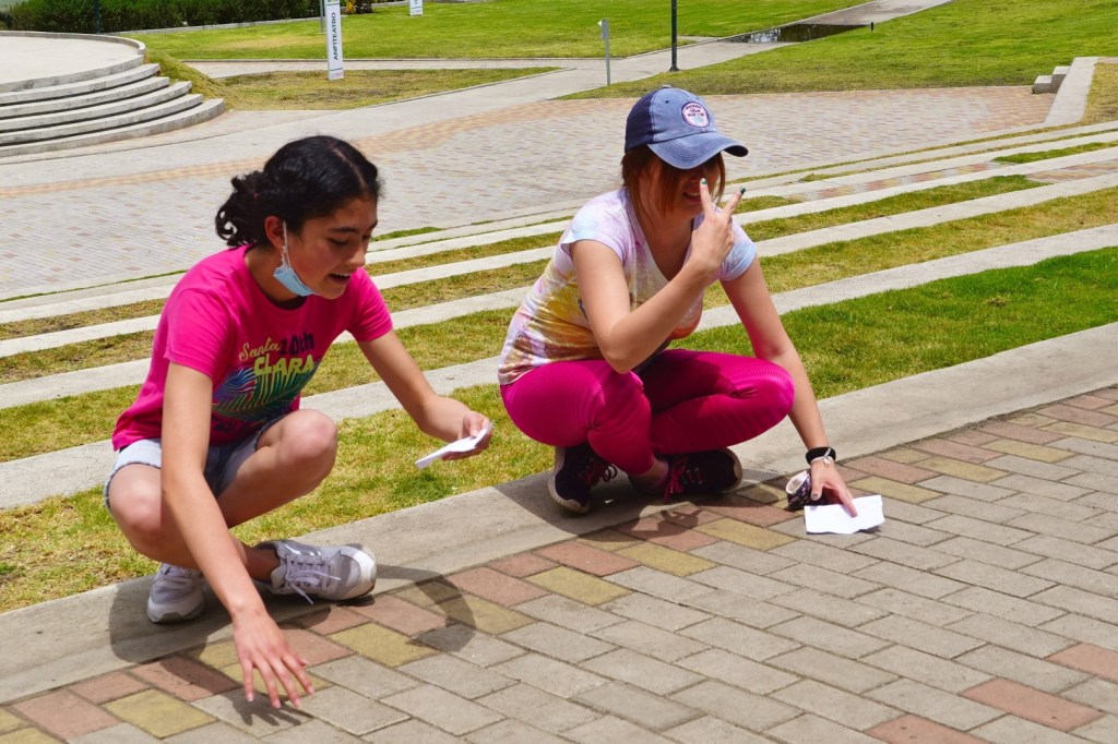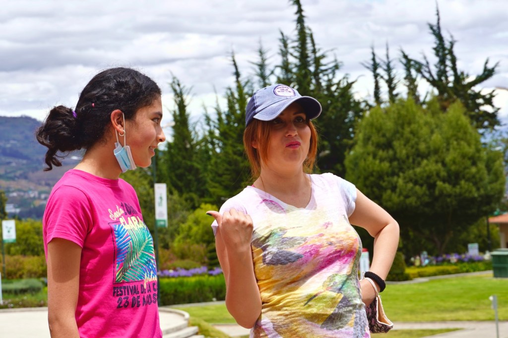 So the big day came, and we headed to the local park, Parque de las Flores, with the only props we would need: a stool borrowed from the school, a crudely homemade sign with an arrow (pointing in the direction of the racecourse the Tortoise and Hare followed), a bottle of “glue” (a.k.a. a TSA approved travel-sized bottle of sunscreen) and a jump rope. But since no jump ropes were readily available we hastily fashioned one out of our clothes line and a couple of shoelaces that we have squirreled away in our backpacks. The tree branch we figured we could find on site. There were already quite a few locals in the park, including some engaged in group activities. But we staked out what was probably the best available venue: the steps in front of the huge Ambato sign. Certainly not ideal, but also certainly not the worst place we’d ever performed.