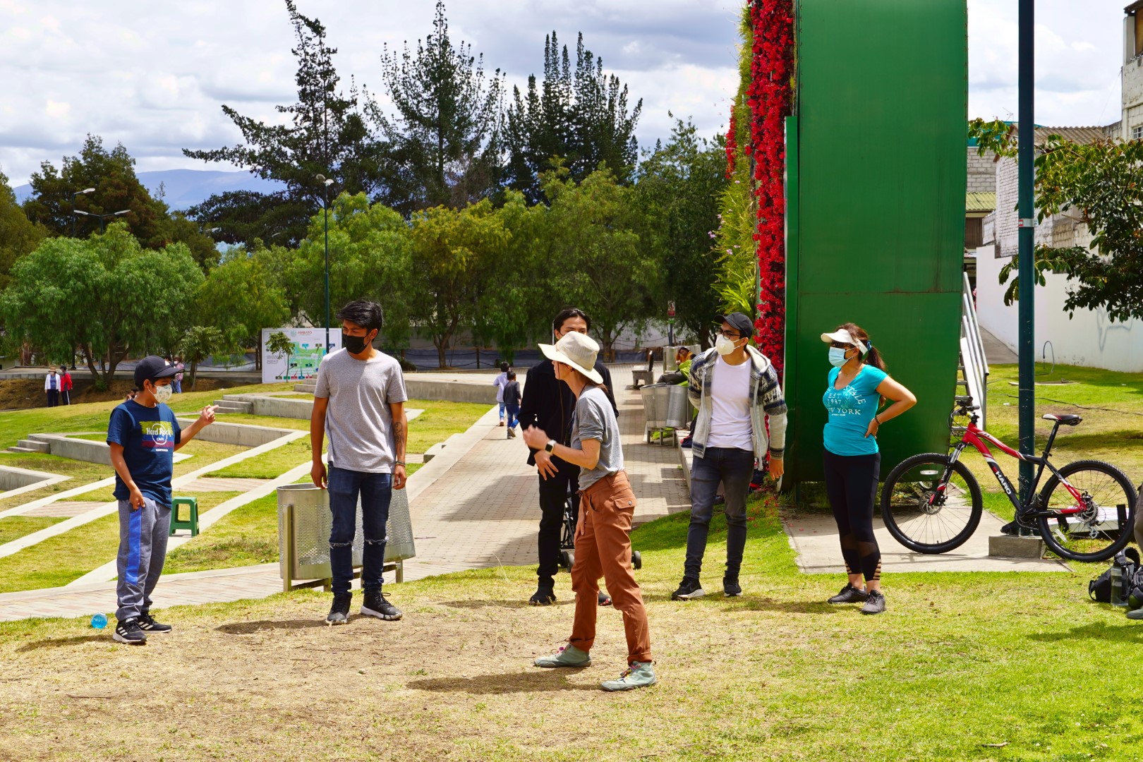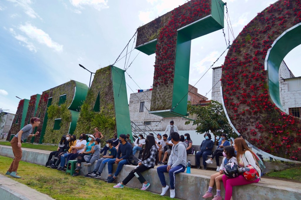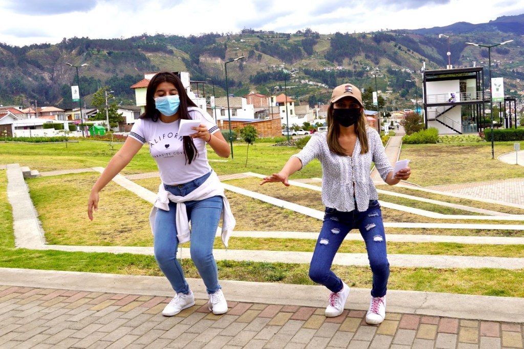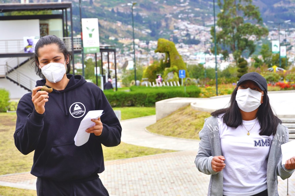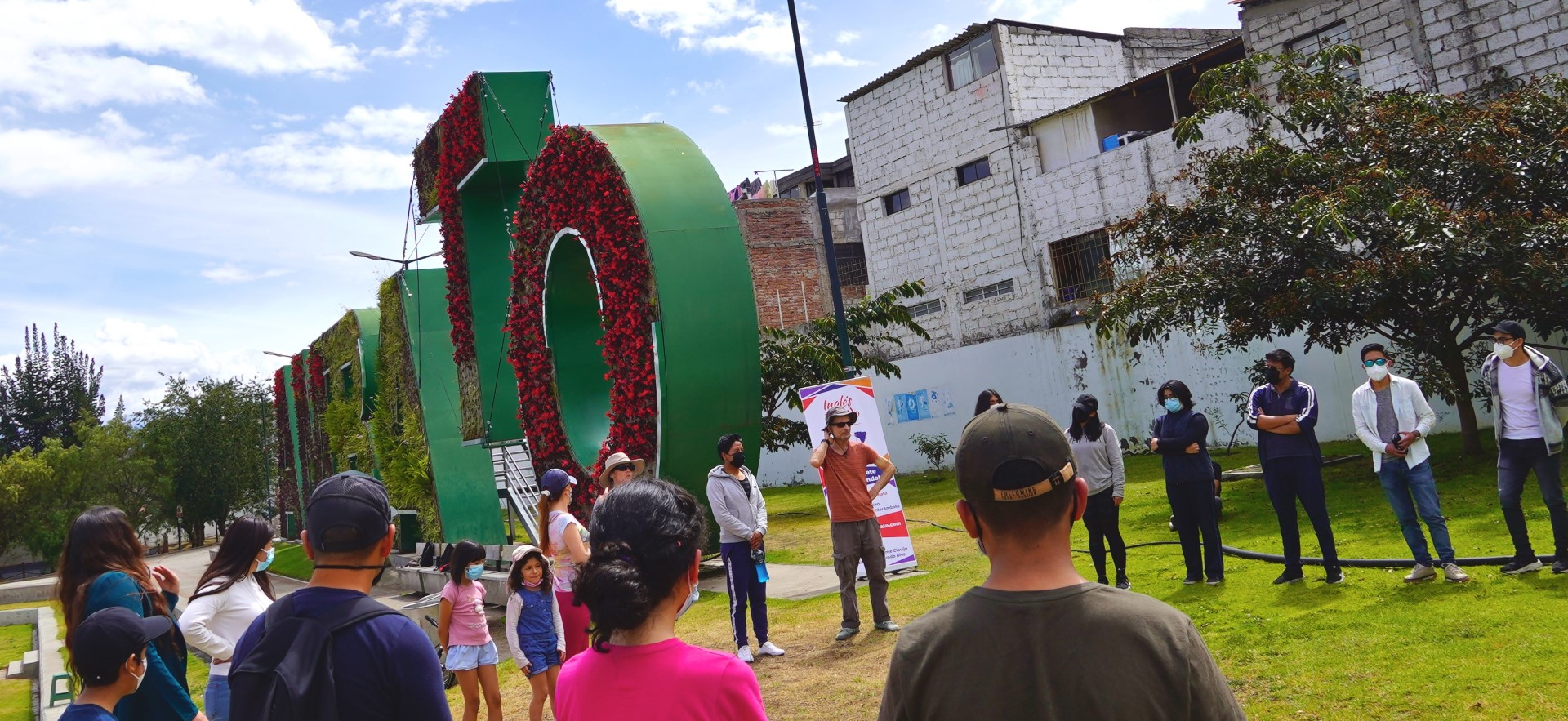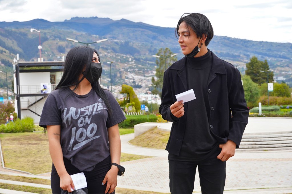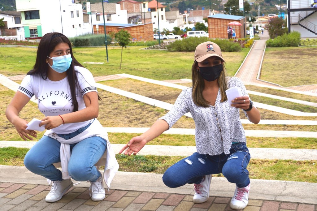 So the big day came, and we headed to the local park, Parque de las Flores, with the only props we would need: a stool borrowed from the school, a crudely homemade sign with an arrow (pointing in the direction of the racecourse the Tortoise and Hare followed), a bottle of “glue” (a.k.a. a TSA approved travel-sized bottle of sunscreen) and a jump rope. But since no jump ropes were readily available we hastily fashioned one out of our clothes line and a couple of shoelaces that we have squirreled away in our backpacks. The tree branch we figured we could find on site. There were already quite a few locals in the park, including some engaged in group activities. But we staked out what was probably the best available venue: the steps in front of the huge Ambato sign. Certainly not ideal, but also certainly not the worst place we’d ever performed.