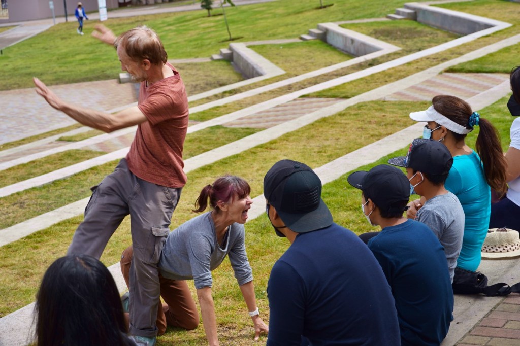 As it happened, we already had a good candidate for a tale: The Tortoise and the Hare, which is a story that can be enjoyed by all ages, and is familiar to most people, so a language barrier isn’t such an obstacle (especially given our highly physical performance style). And it was one of the last stories we performed, so it was still fairly fresh, and would require only a little brushing up. Dennis managed to find a few poems that fit the criteria (including one of his own). And as for the theatre activities, we had a repertoire of quite a few, and had successfully tried them out only a few weeks earlier on a group of non-native English speakers in Mexico.