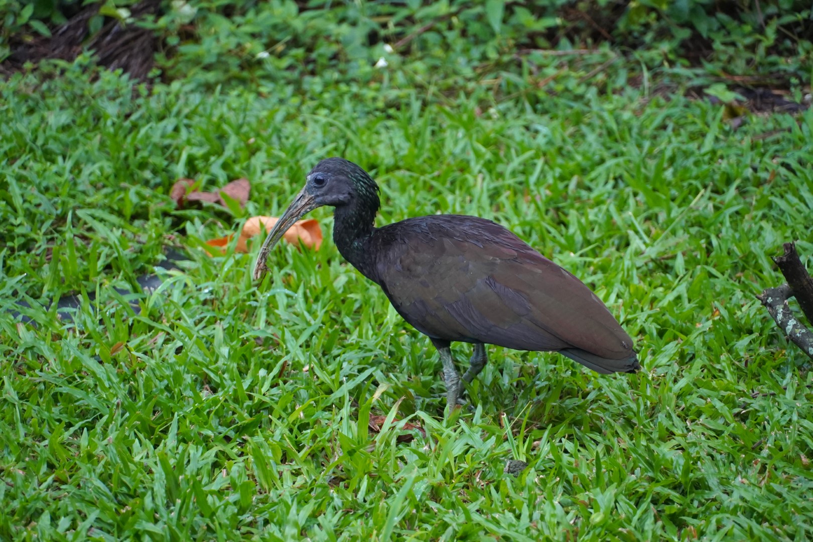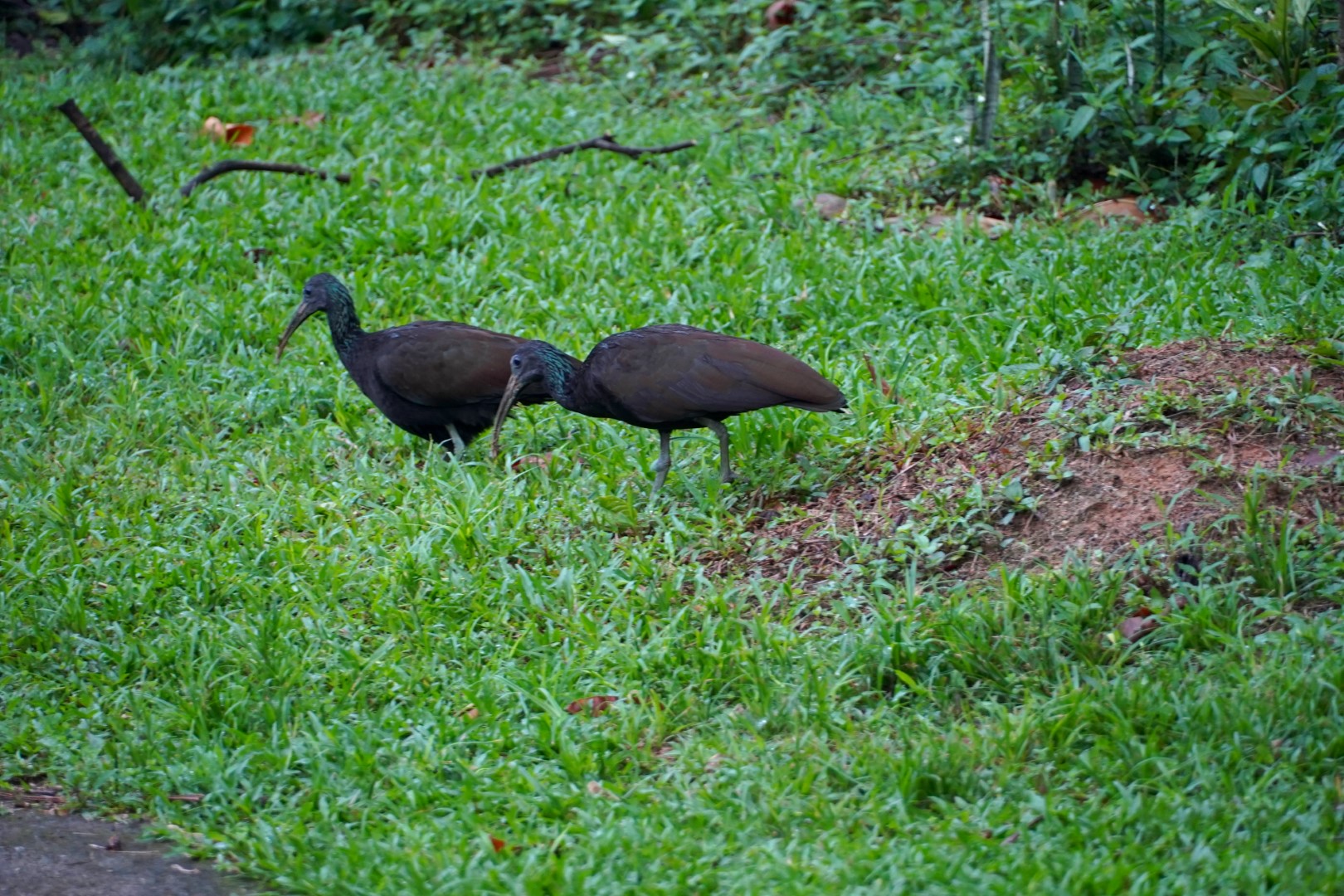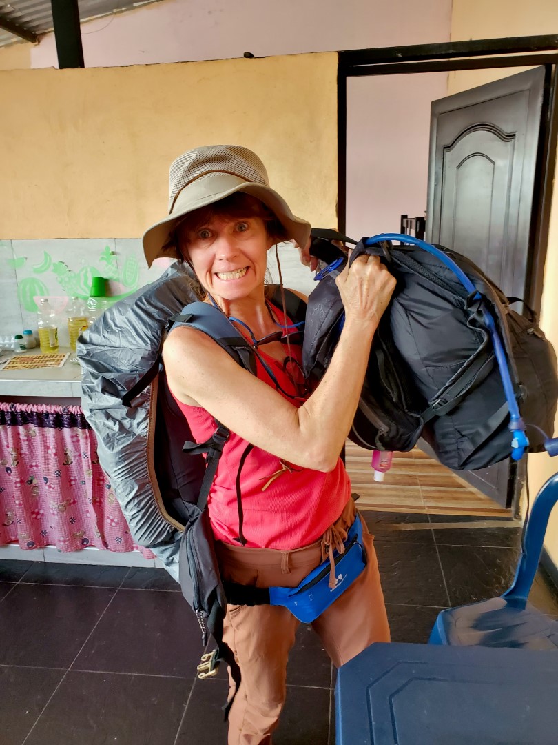 When we arrived, the park was closing for the day, though the rustic restaurant and lodge at the entrance was still open. So we went inside for a bit to wait for our next driver to take us to our digs. That ride was in a little electric buggy, not much bigger than a golf cart. It took us down the hill, on a road that was not much more than a footpath. And down. And down, and down and down. On an angle so steep that we had to hold onto something to keep from tumbling into the driver’s lap. (In the three weeks to come, we’d become very well acquainted with this steep climb.)