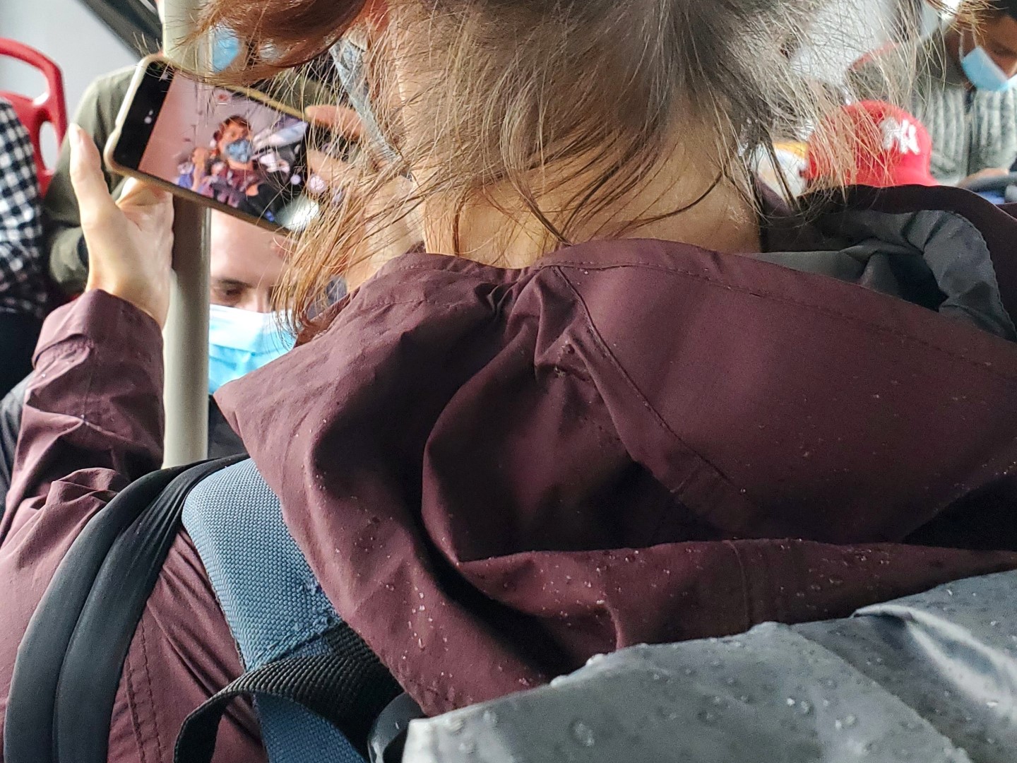 The train was packed to the eyeballs, and we had to stand, clutching all of our bags, for at least half the trip. At one point, a seat was vacated in front of Dennis, but before he could sit down, a lady on the other side of the partition by the stepwell quickly slid her bag through the opening in the partition and onto the seat to stake it out for herself. A bit of a switch from the courtesy among passengers we so commonly observed in Mexico.