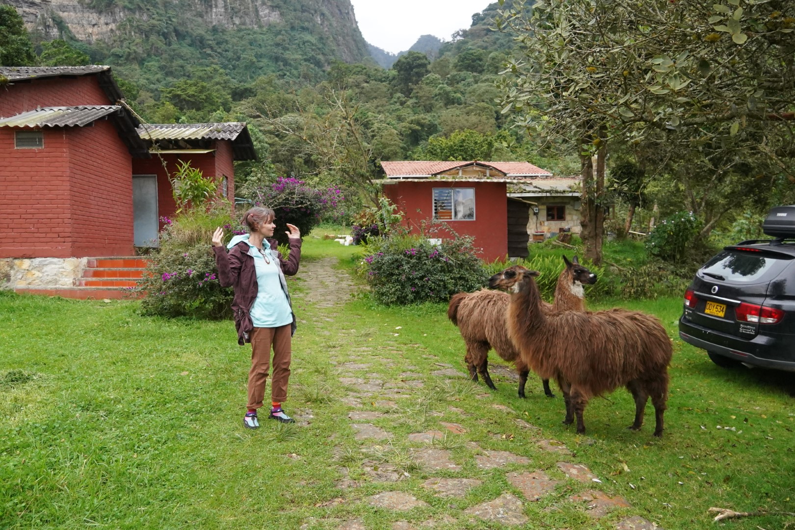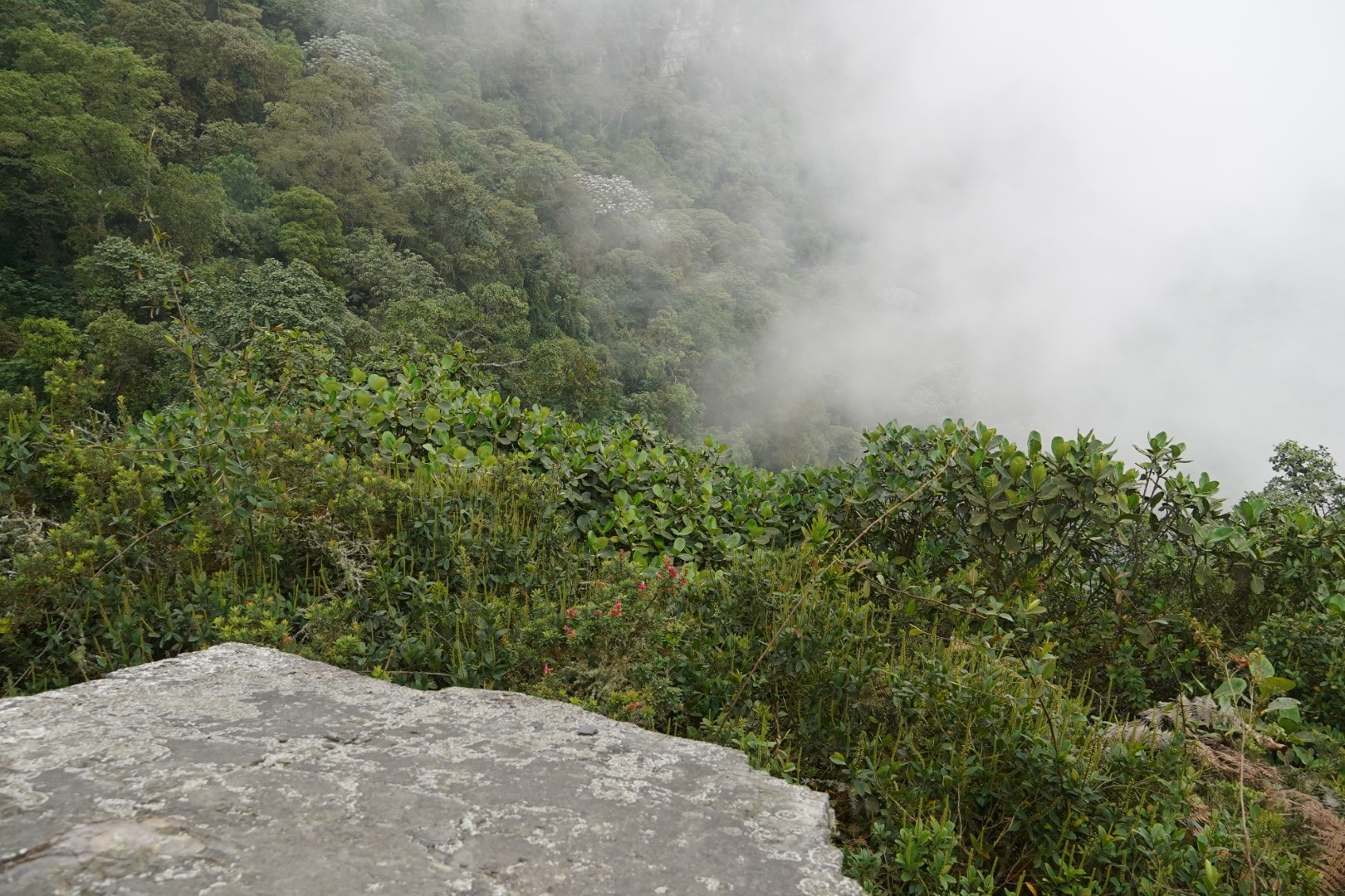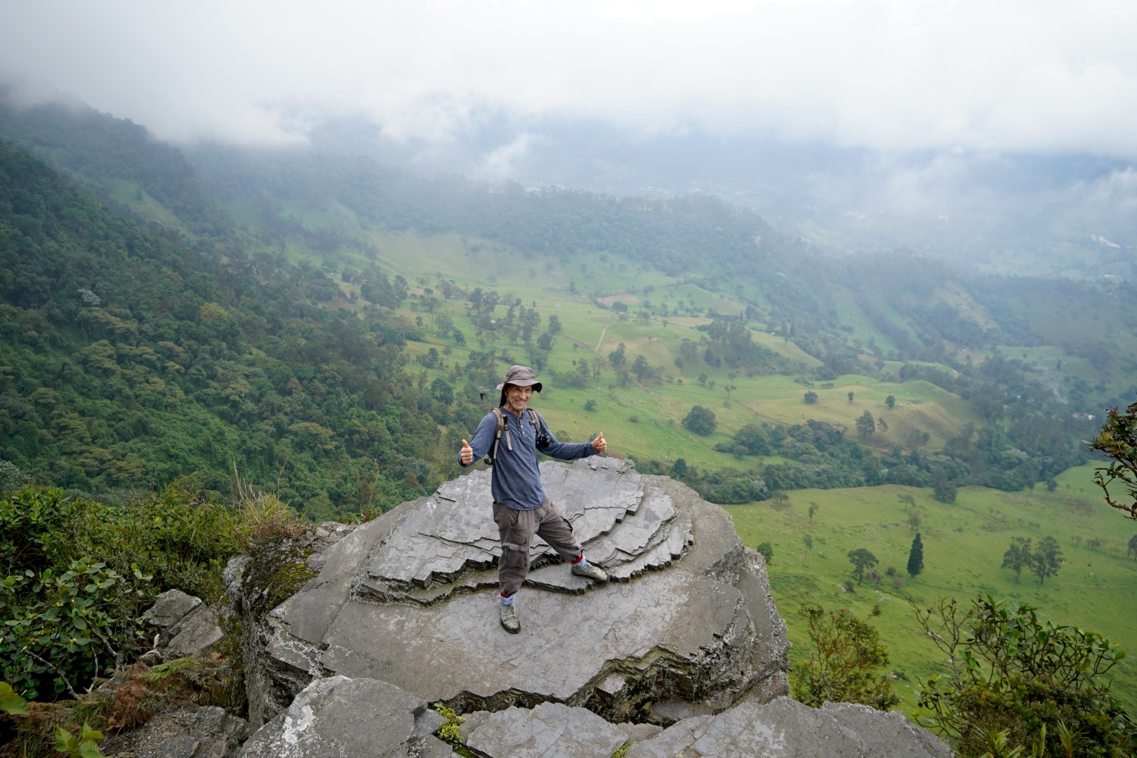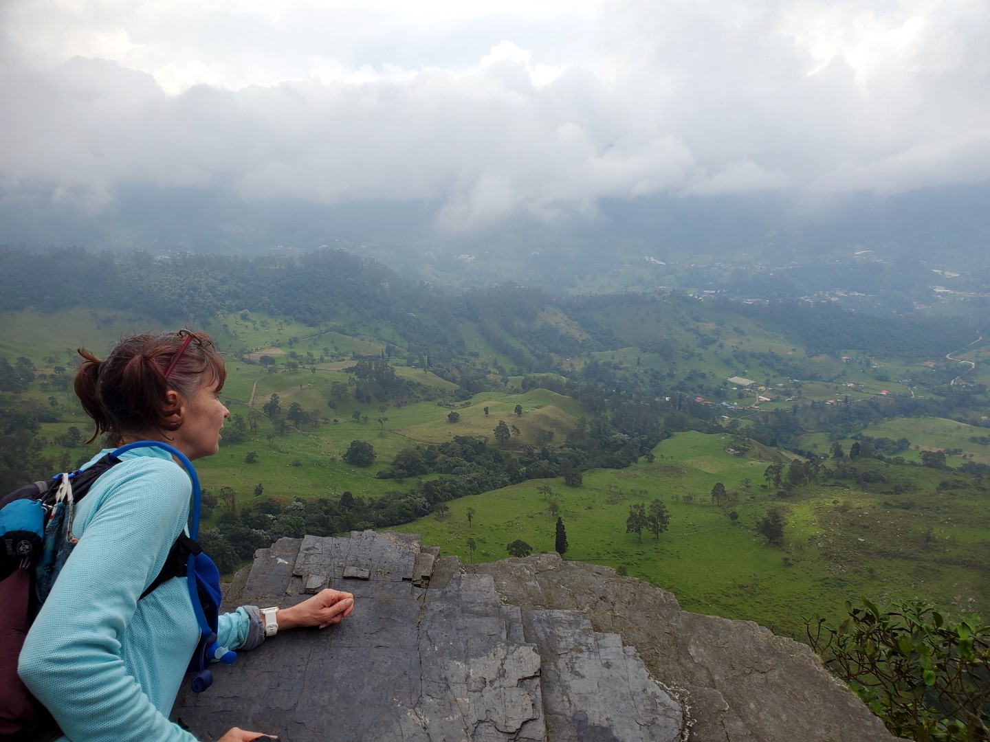 With our first week of volunteering concluded at UBHA school, we were free to spend a 3-day weekend hiking through the stupendous Chicaque Natural Park. On Saturday morning, we set out on a hike to visit one of its landmarks: Pico (the peak), which on a clear day offers a sweeping view of the valley below. (Pico is also short for Pico del Aguila, meaning “eagle’s beak”, which is what this formation resembles.) This wasn’t a particularly clear day, and in fact was either very foggy/ cloudy (hard to tell the difference at this altitude) or rainy most of the day — indeed, it never dried up much during our entire stay in the park, and our shoes stayed wet pretty much the whole time. But even on this mostly rainy/cloudy/foggy day we still managed to sneak in some pretty good peeks form the peak of the beak.