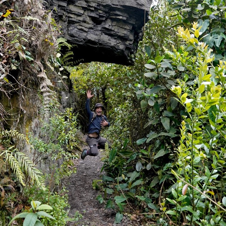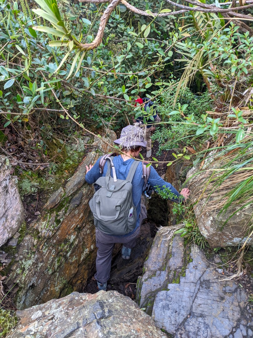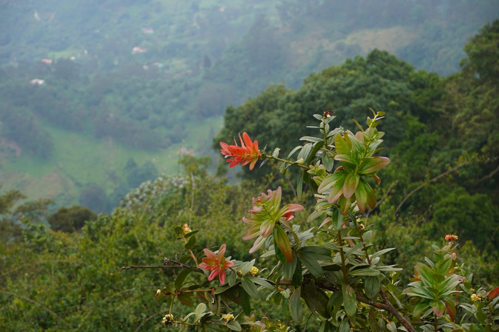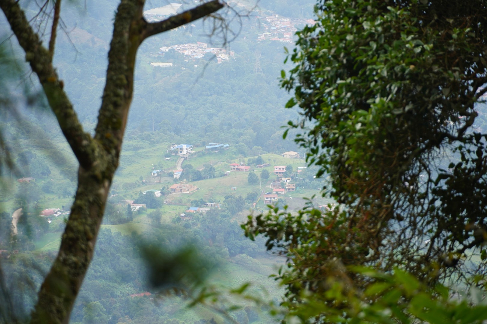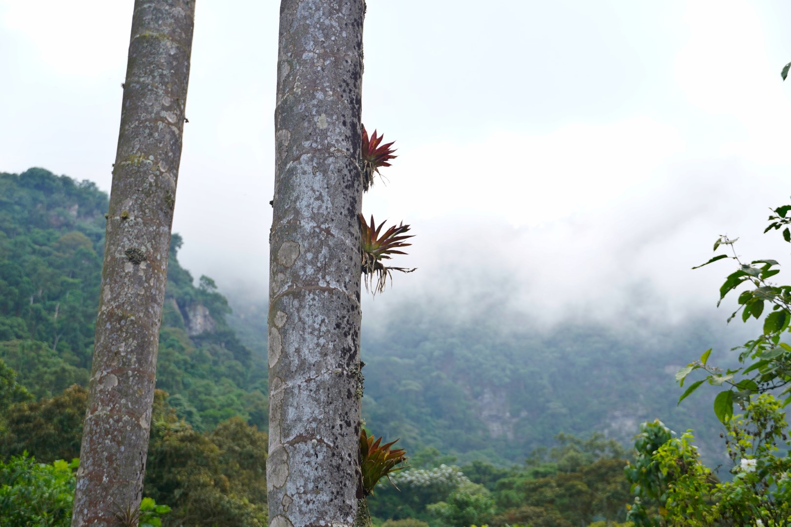With our first week of volunteering concluded at UBHA school, we were free to spend a 3-day weekend hiking through the stupendous Chicaque Natural Park. On Saturday morning, we set out on a hike to visit one of its landmarks: Pico (the peak), which on a clear day offers a sweeping view of the valley below. (Pico is also short for Pico del Aguila, meaning “eagle’s beak”, which is what this formation resembles.) This wasn’t a particularly clear day, and in fact was either very foggy/ cloudy (hard to tell the difference at this altitude) or rainy most of the day — indeed, it never dried up much during our entire stay in the park, and our shoes stayed wet pretty much the whole time. But even on this mostly rainy/cloudy/foggy day we still managed to sneak in some pretty good peeks form the peak of the beak.