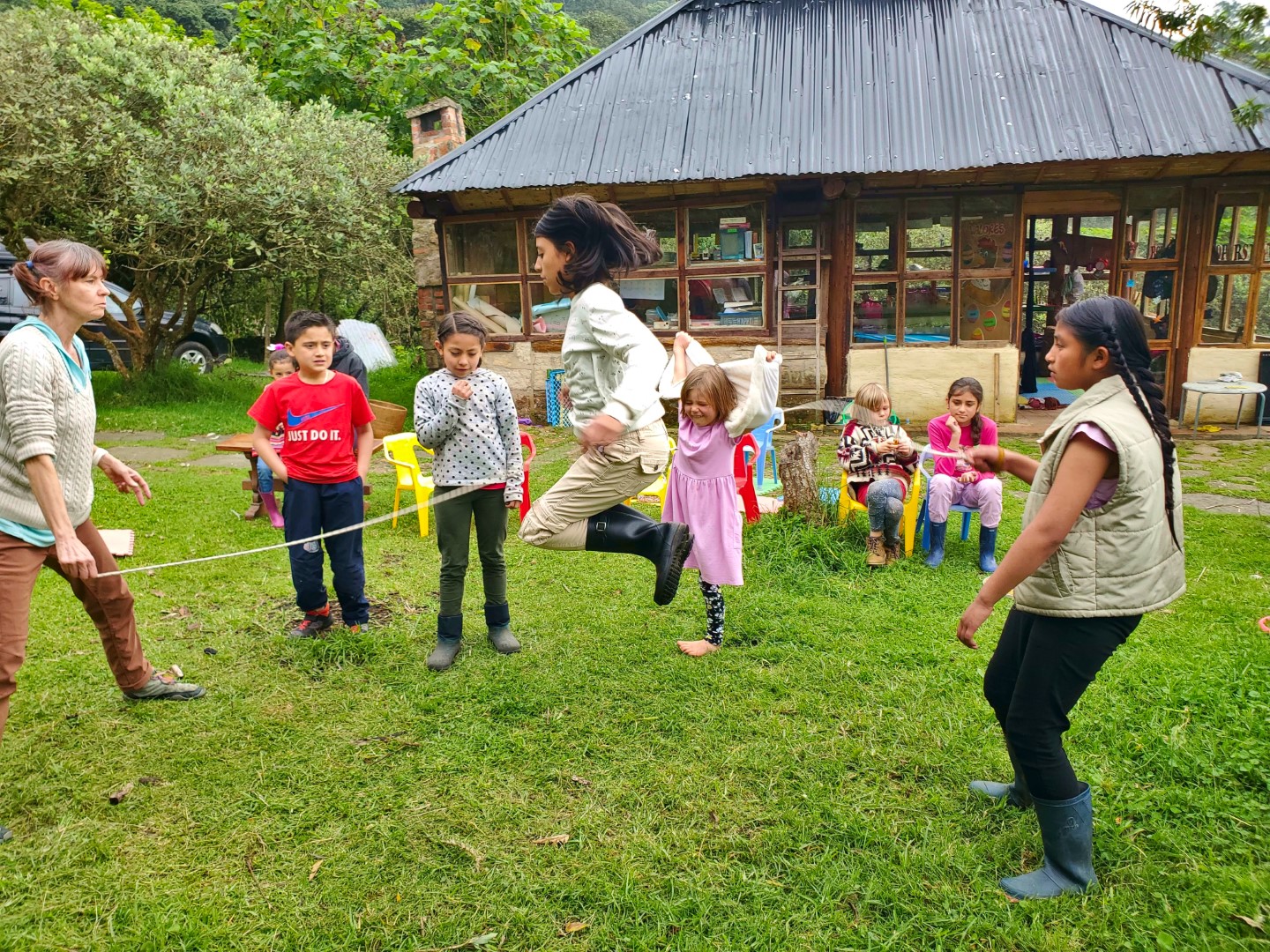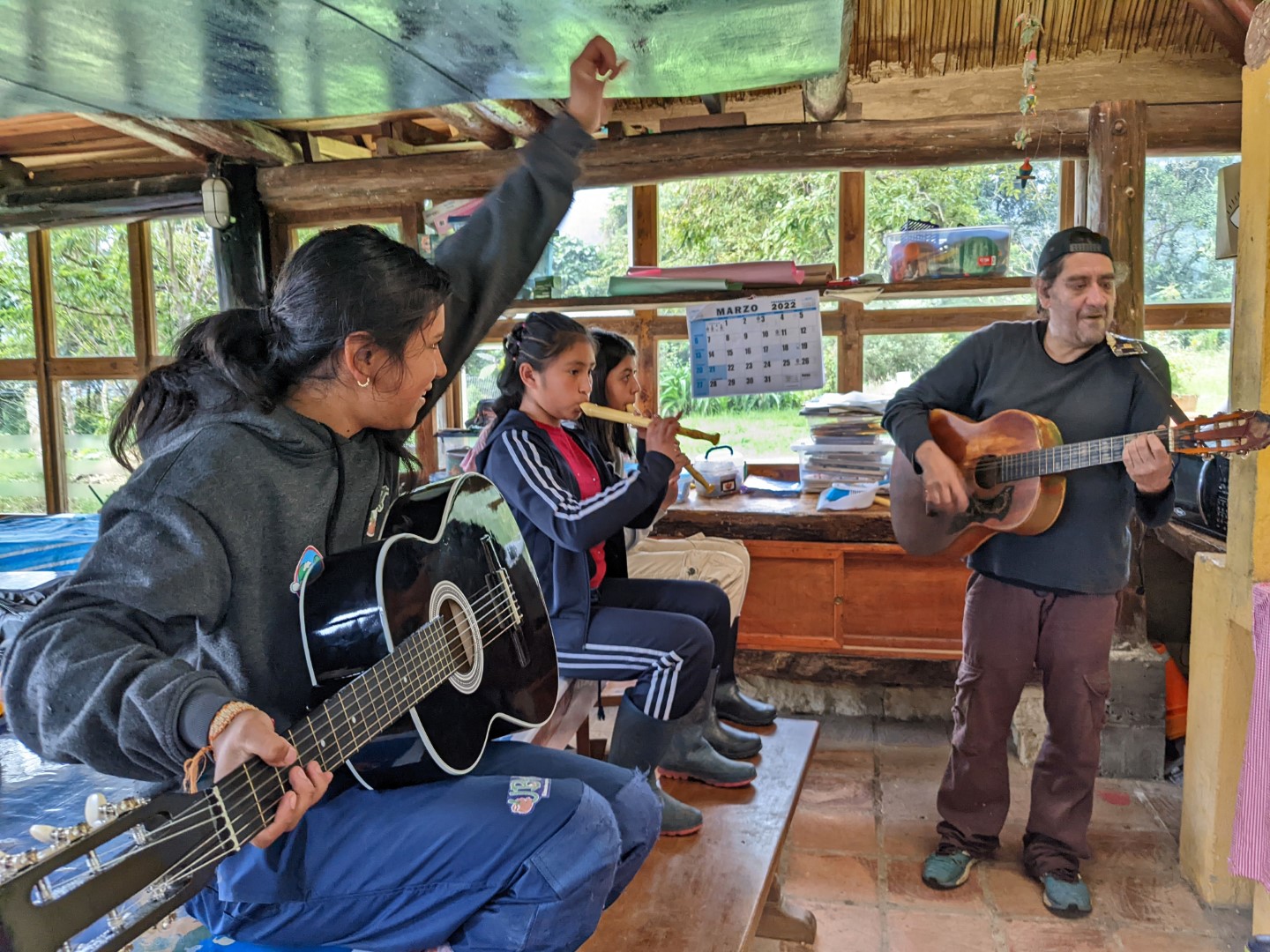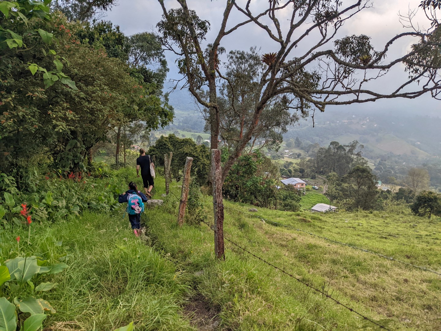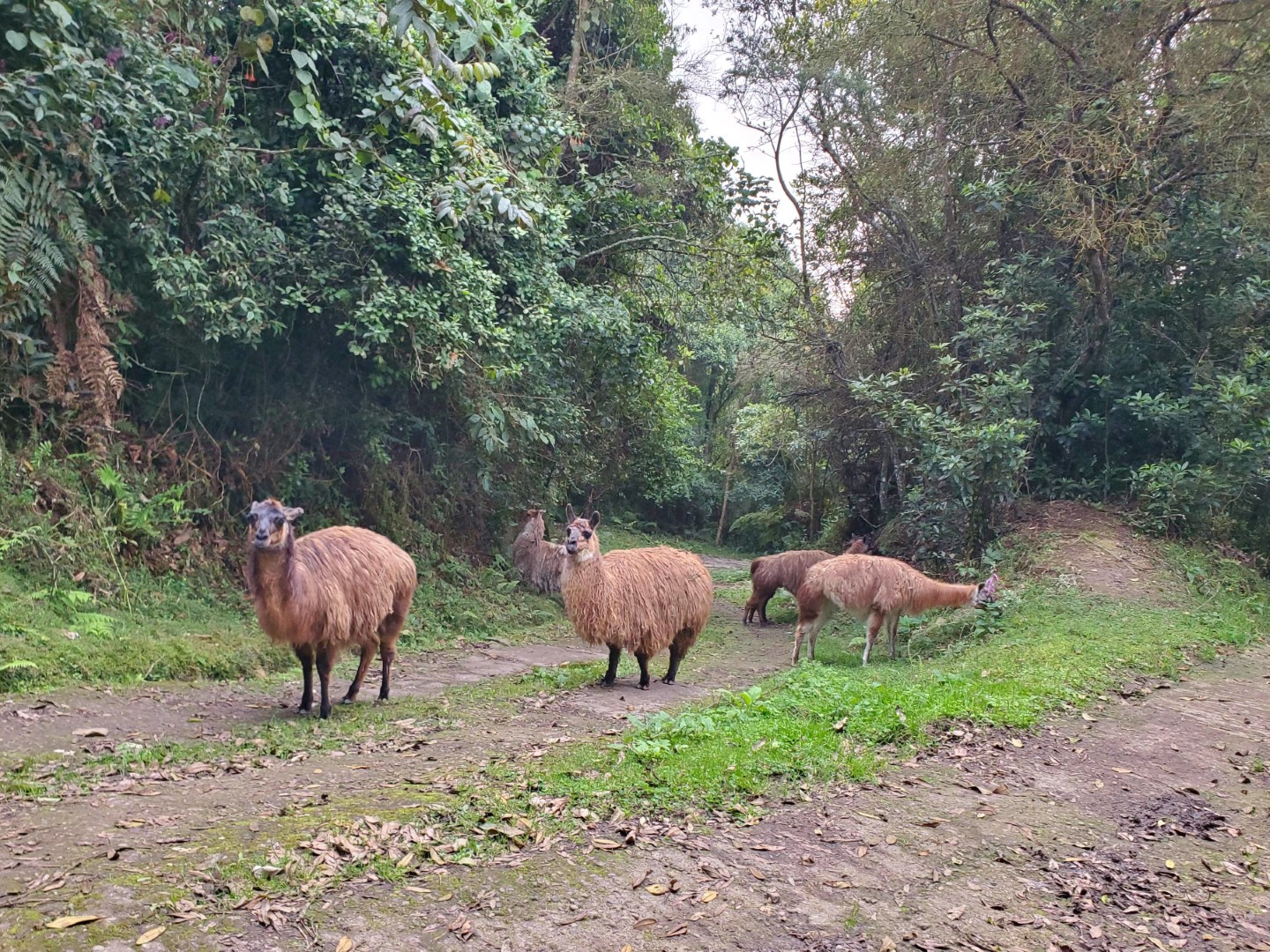 On some mornings, one of us would have to hike up the hill through Chicaque Natural Park starting at about 7:30 to meet the kids at the park entrance at about 8:45 and escort them down the hill to the school. And on some days, one of us would have to escort them back up the hill to catch their bus at the entrance. And we can’t overemphasize how amazing and inspiring these youngsters were; they cheerfully endured these very strenuous hikes and long bus rides on a daily basis. One of the students was only 4 years old, and she more or less kept pace with the rest of the pack, chattering away the whole time, and making a game out of the steep climb. (And if she became too dependent on her adult escort to negotiate the steep steps, her comrades would order us not to help her, insisting that she be self-sufficient.) Not once did any of the kids ever whine or complain, ask to be carried or fight with one another. Of course, it helped that there was such gorgeous scenery en route, and plenty of enticing places to stop and catch your breath. Not to mention frequent encounters with llamas and other wildlife.