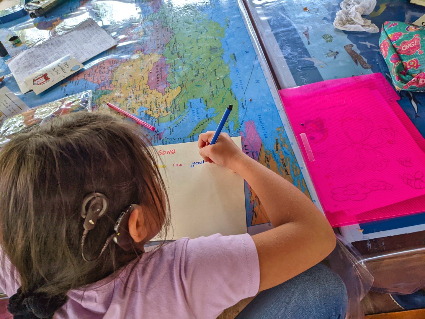 We were asked to teach them a song in English on the spot. So we came up with “Row, Row, Row your Boat” and taught them how to do it in rounds. They each made a copy of the lyrics and hung one of them on the wall.