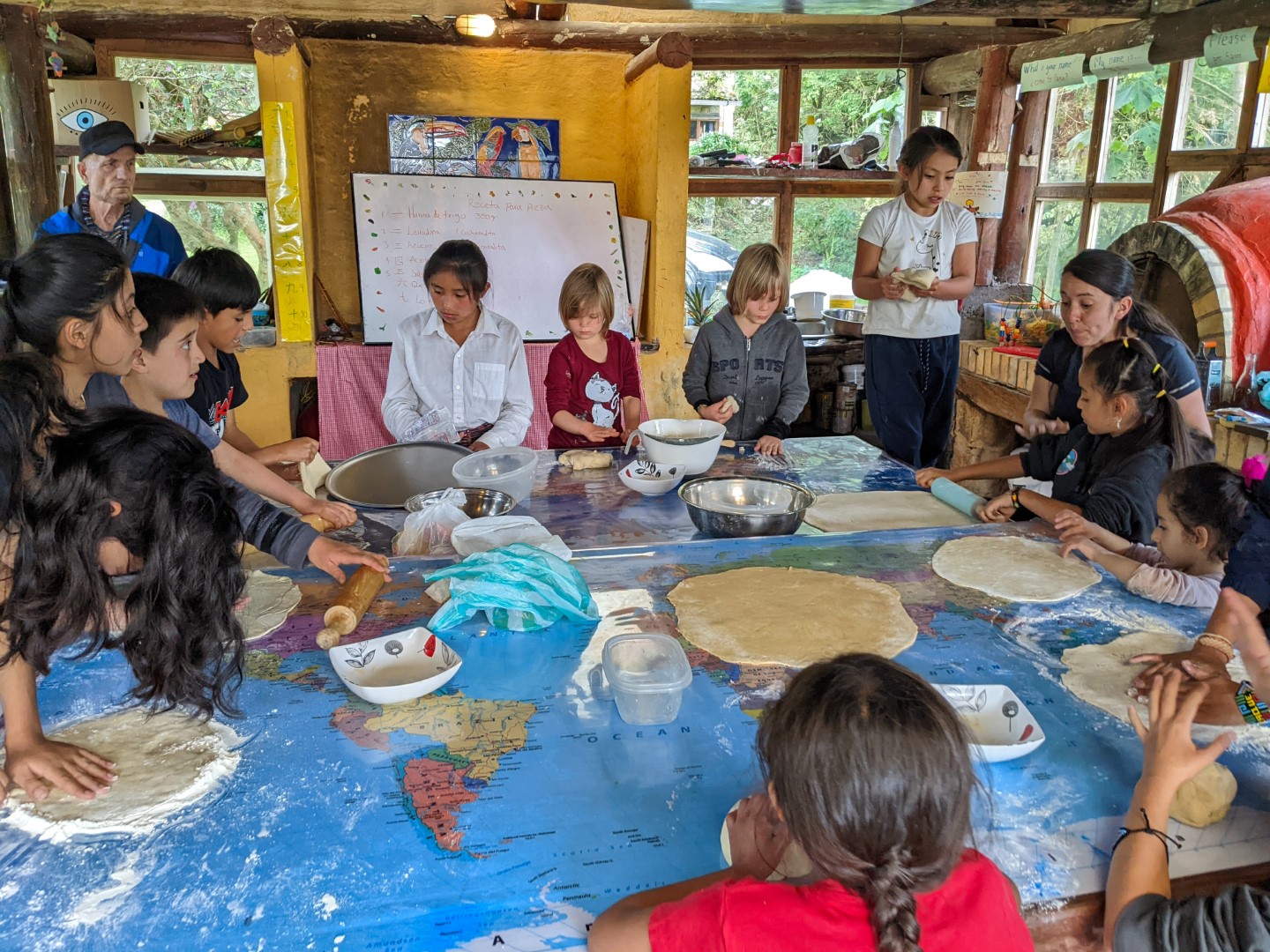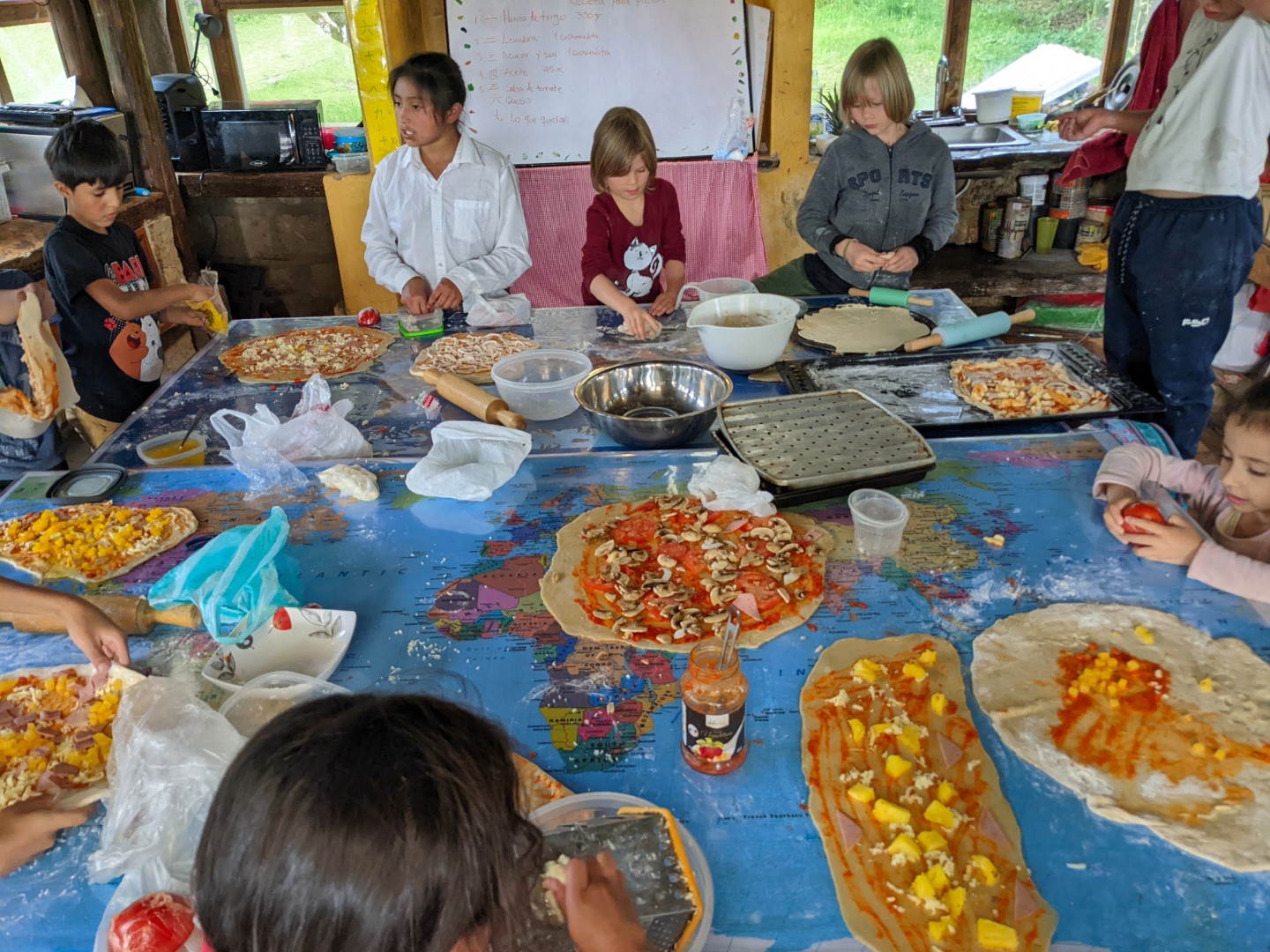 Also during this week, the students crafted pizzas from scratch. Not just little personal size snack pizzas, but each one made one large enough to feed a family of about four. And they gave one of them to us. Some of these pizzas were baked in the ovens in our house; and while we were waiting, some of the boys brought in a little snake they’d found to show off. It was rather tasty — the pizza, not the snake.