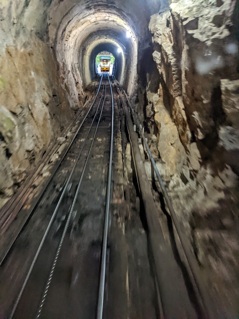 That left the other option — the funicular, a very steep cable car up the side of that mountain. So we hopped aboard and scooted up, and got the best view of the city to be had anywhere except from an airplane. Well, it could have been better — it was quite hazy on this day. Still, that gloriously immense Monopoly board of the city loomed below us for many miles. There were restaurants up at the top, rather elegant with a splendid view. Had it been a clear day, we even might have considered splurging for a meal. But we didn’t this time.