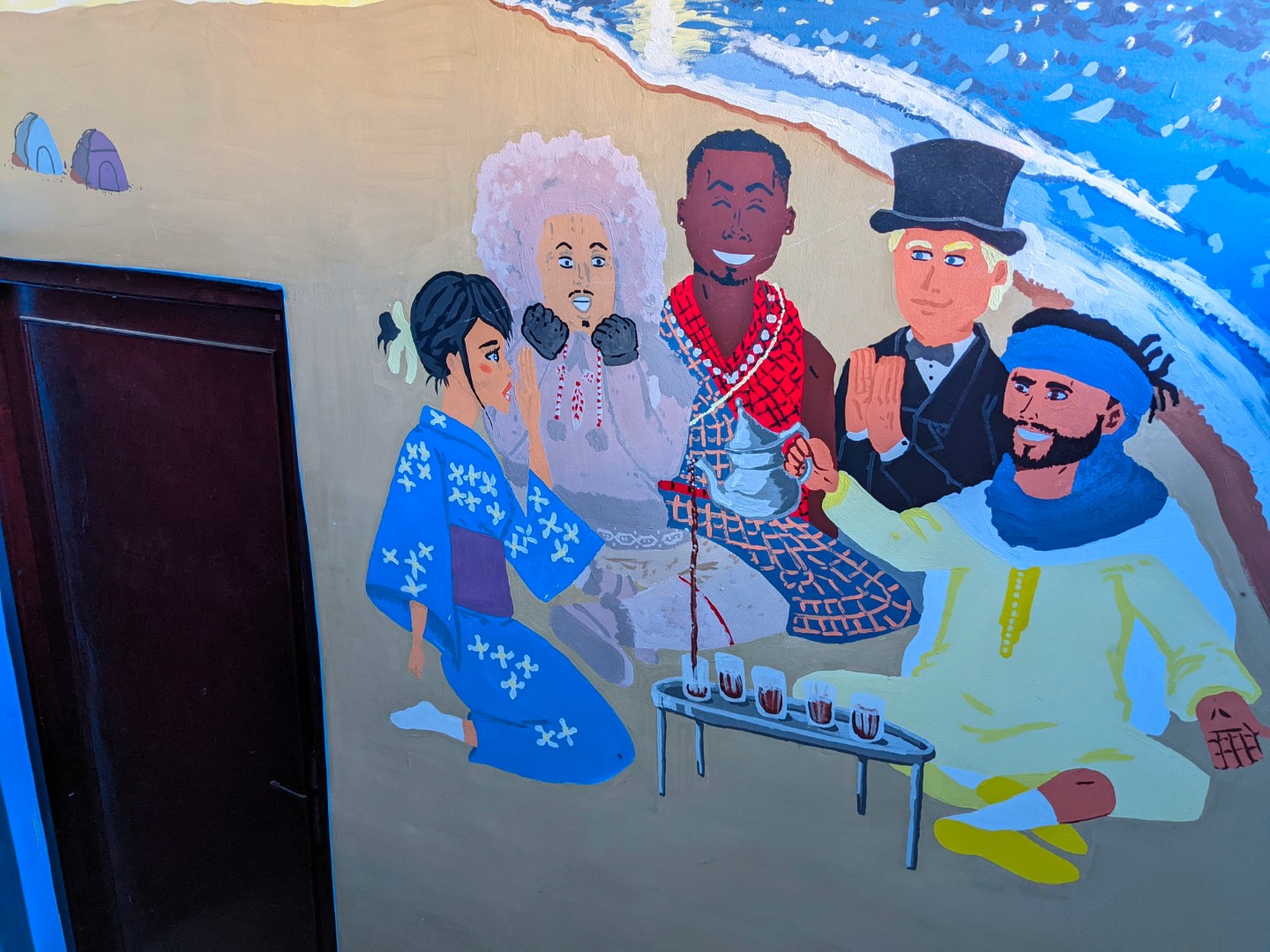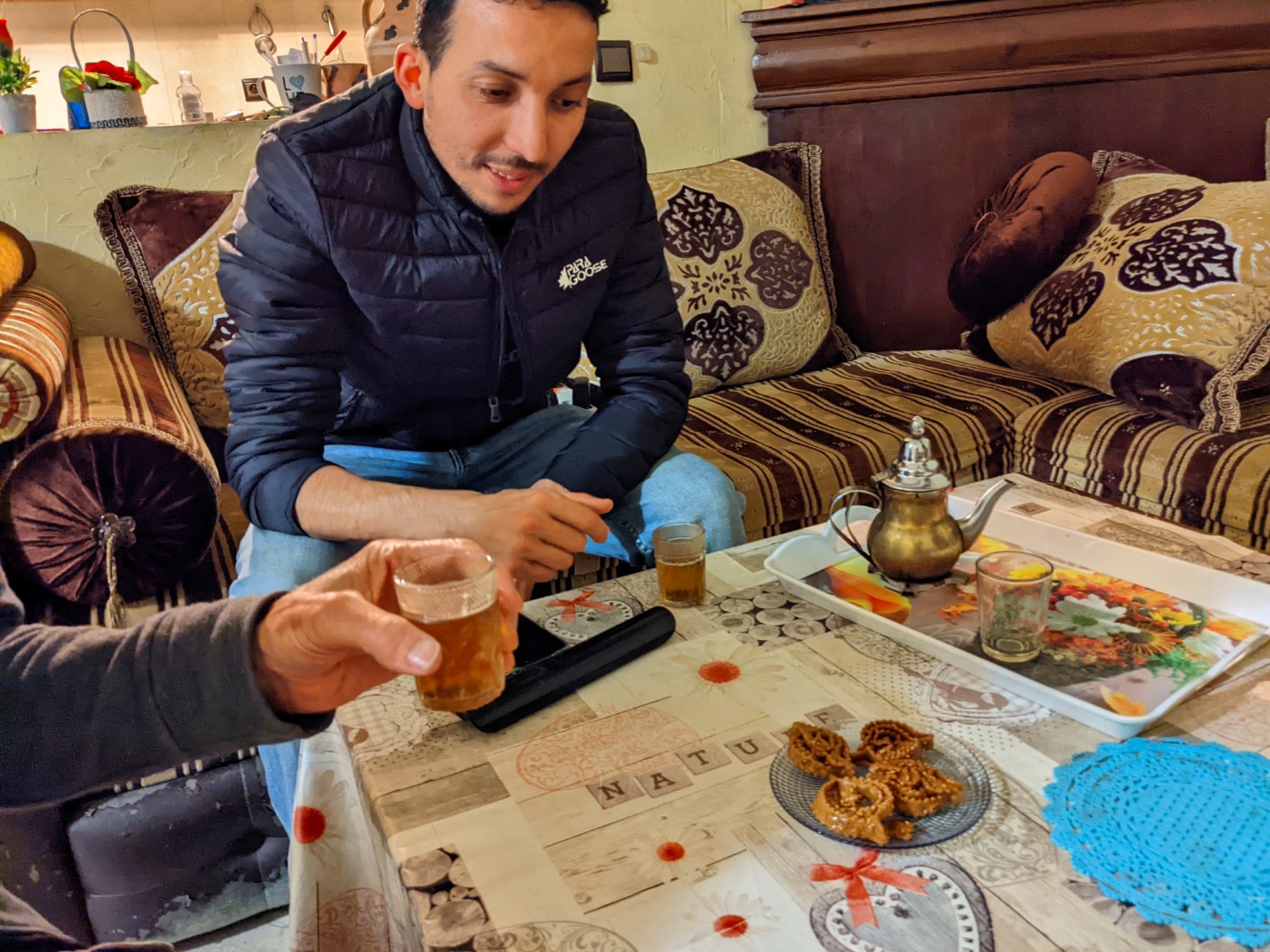 Rachid was an excellent host who did everything he could to make us comfortable. Upon our arrival, he served us tea, Moroccan style – strong green tea, sweetened. Moroccans are major league tea drinkers, and they have a rather elaborate little procedure for serving it that involves pouring it out of the pot into cups, then pouring back into the pot before serving it, and holding the pot up high while pouring. Later we learned that this gesture is a sign of respect, and the higher the host holds up the pot, the more respect he is demonstrating. Reportedly, those who serve tea to the king climb onto a ladder to pour.