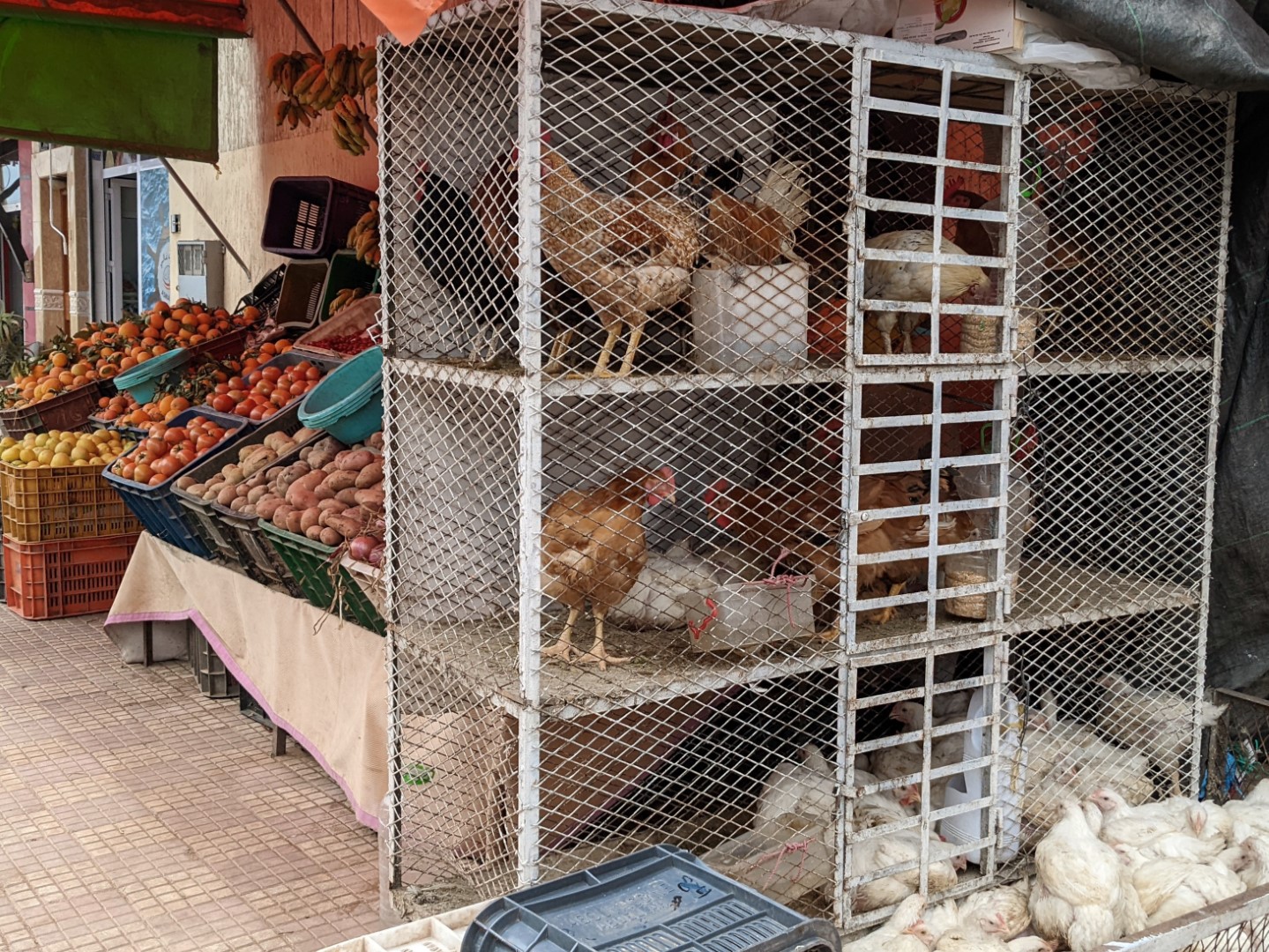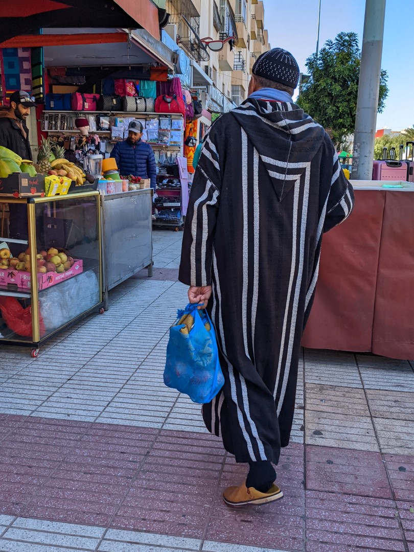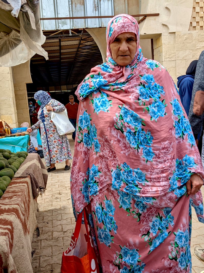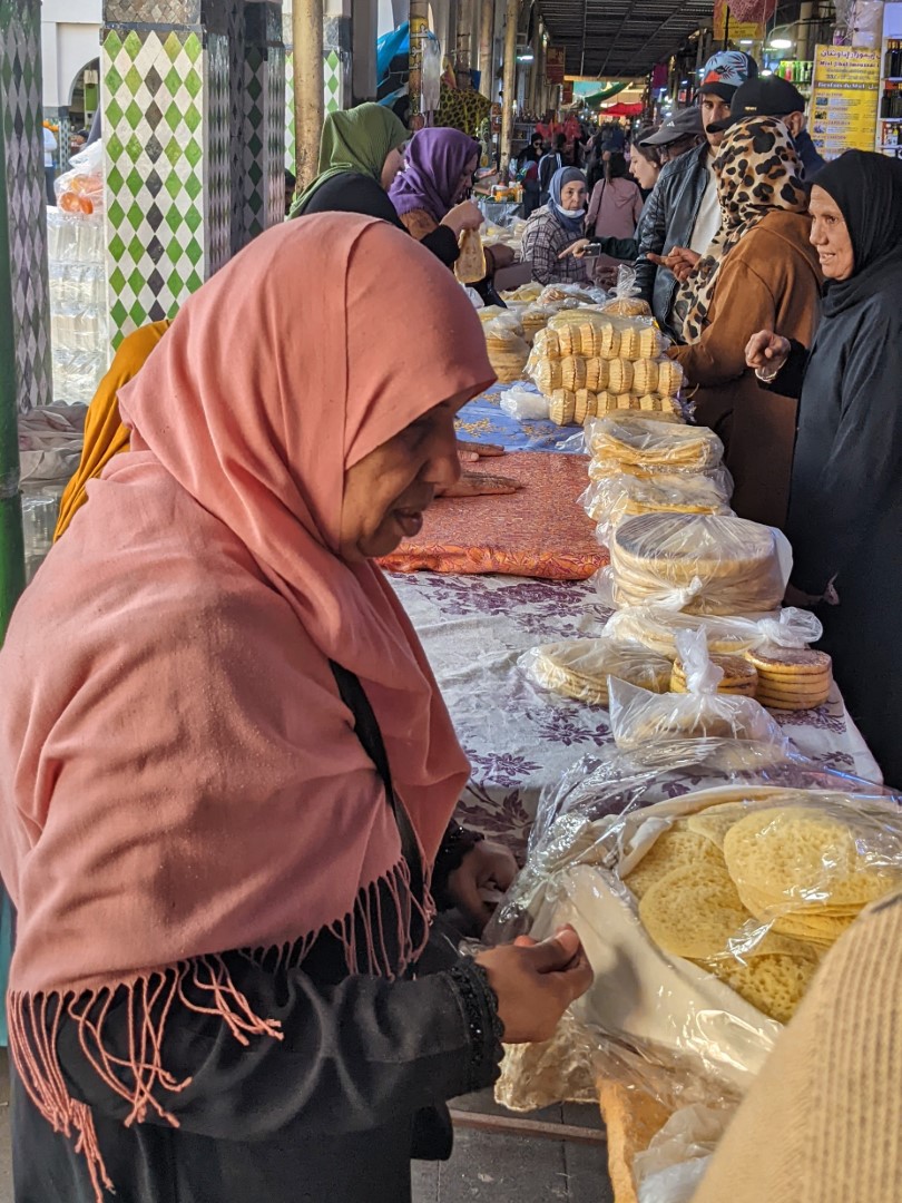 Since checkout time was 11:00, and our ride would not be coming until about 5:00, we asked Ahmed if we could leave our bags there while we went on some errands. (The breakfast we’d been promised, by the way, still had not materialized, so we fended for ourselves.) He readily agreed, so we went on a hike to find a store called Marjane, which was, at long last, a real supermarket/ supercenter, such as we have in the U.S. There we were able to find several items we’d long been searching for, including (oh joy oh bliss) black tea. Bagged rather than loose, but still, honest-to-goodness black tea – and a good variety (Darjeeling) to boot.