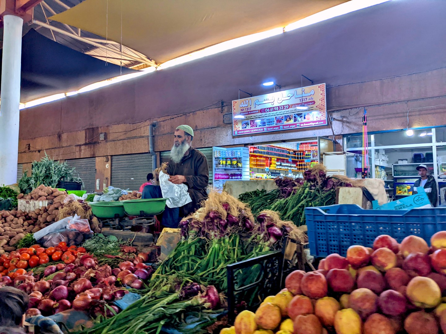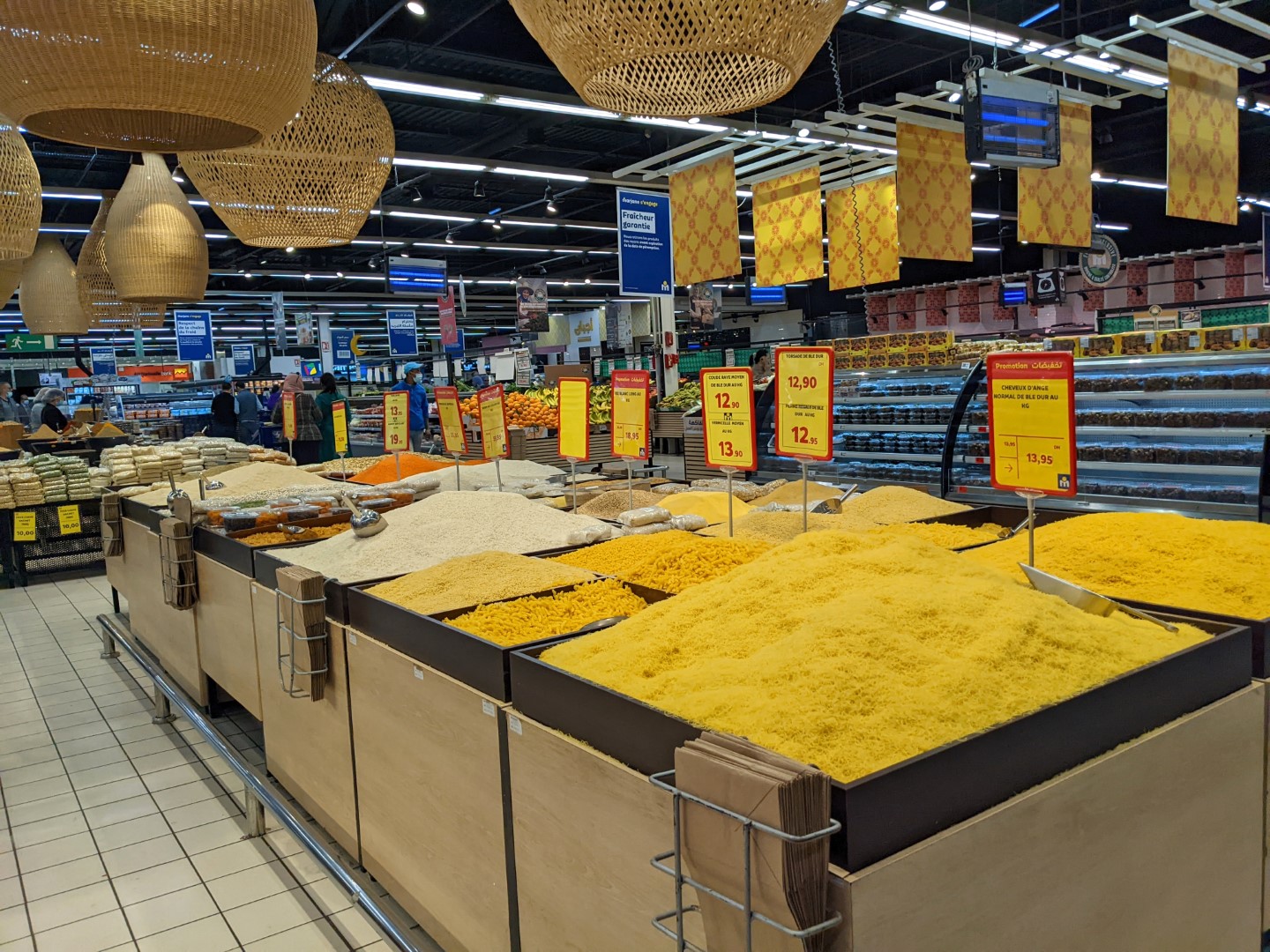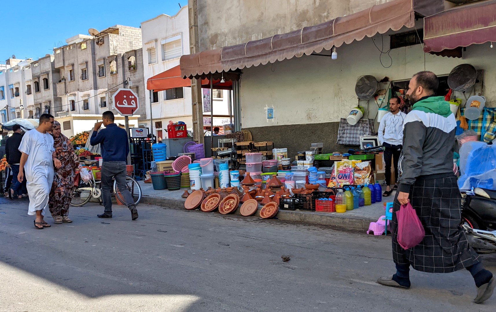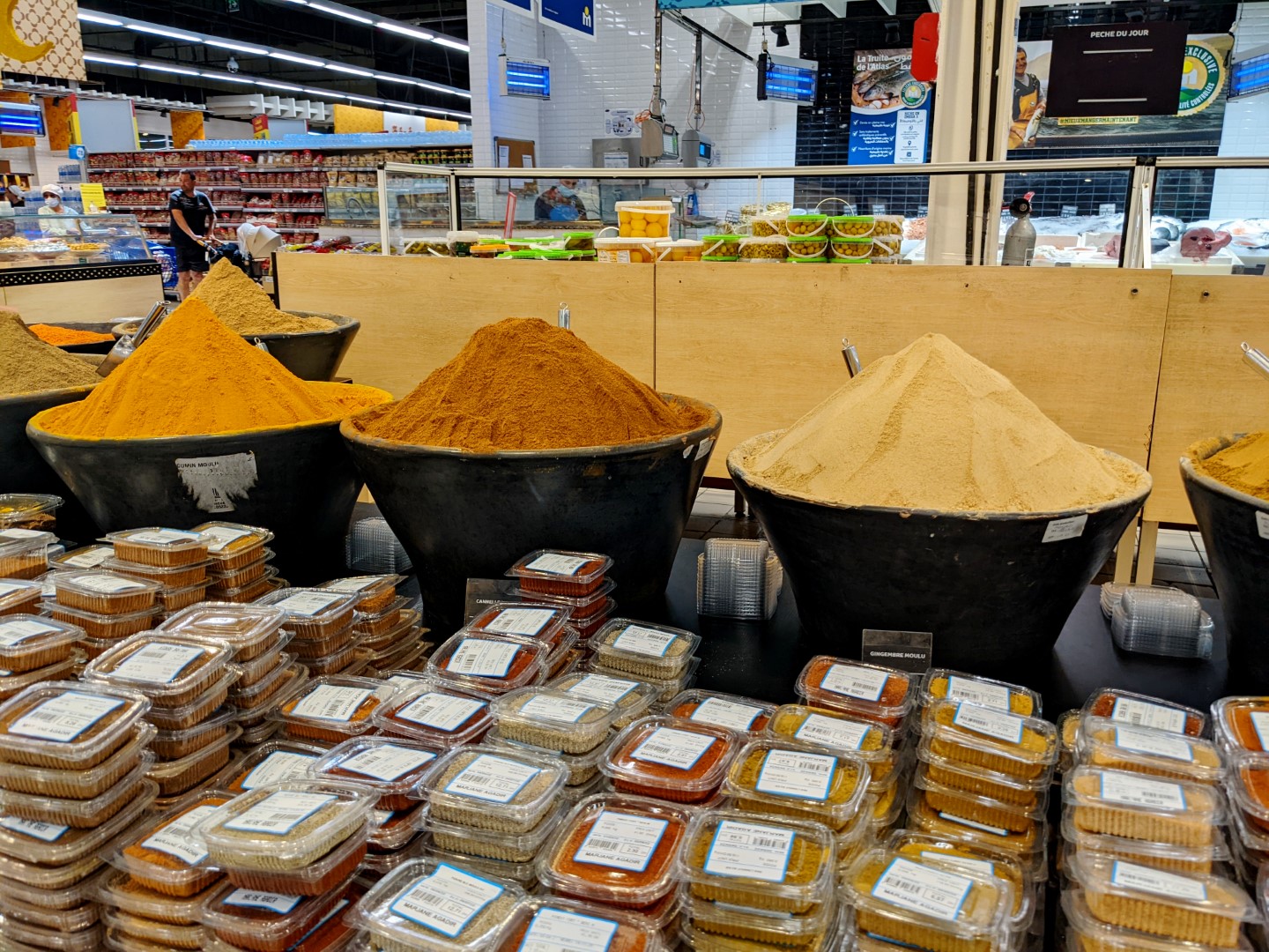 Since checkout time was 11:00, and our ride would not be coming until about 5:00, we asked Ahmed if we could leave our bags there while we went on some errands. (The breakfast we’d been promised, by the way, still had not materialized, so we fended for ourselves.) He readily agreed, so we went on a hike to find a store called Marjane, which was, at long last, a real supermarket/ supercenter, such as we have in the U.S. There we were able to find several items we’d long been searching for, including (oh joy oh bliss) black tea. Bagged rather than loose, but still, honest-to-goodness black tea – and a good variety (Darjeeling) to boot.