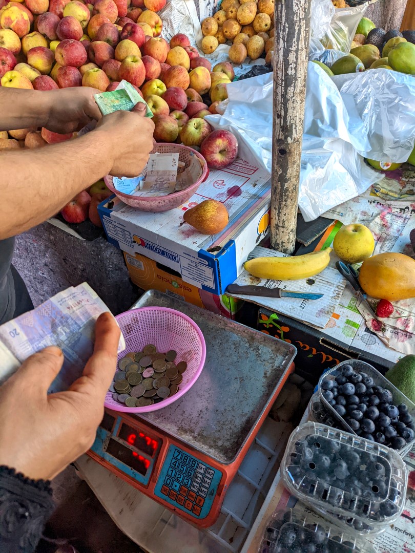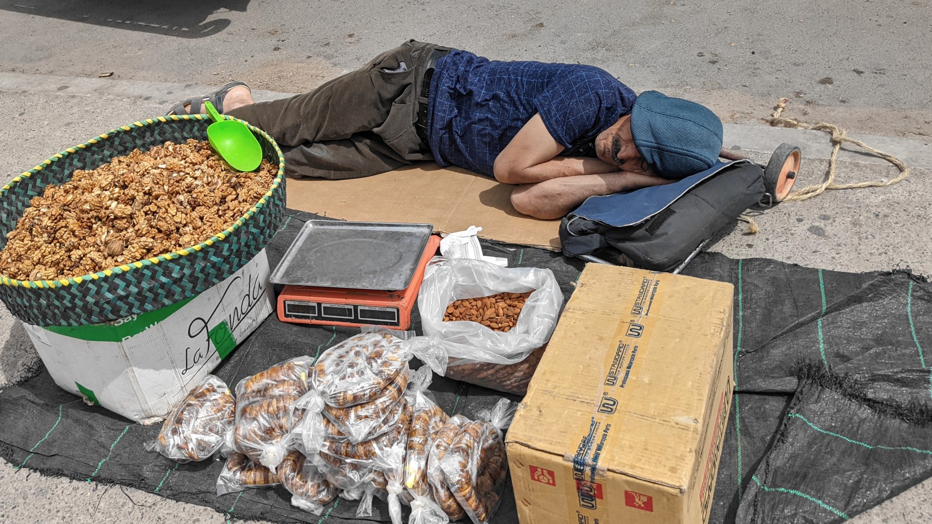 We also walked through a marketplace, and at one point, we passed a seller of nuts (not the same one as yesterday) who insisted on offering us a free sample – with his bare hands, as is customary here. So we reluctantly took his offering, and then after browsing a bit, started walking on. Whereupon he became miffed – or at least pretended to – because we were not buying anything after having a free sample, with the implication that we were moochers or some such. This made us even less inclined to be paying customers, and so we left him to fume, resolving not to accept any more samples from anyone no matter how insistent they are.