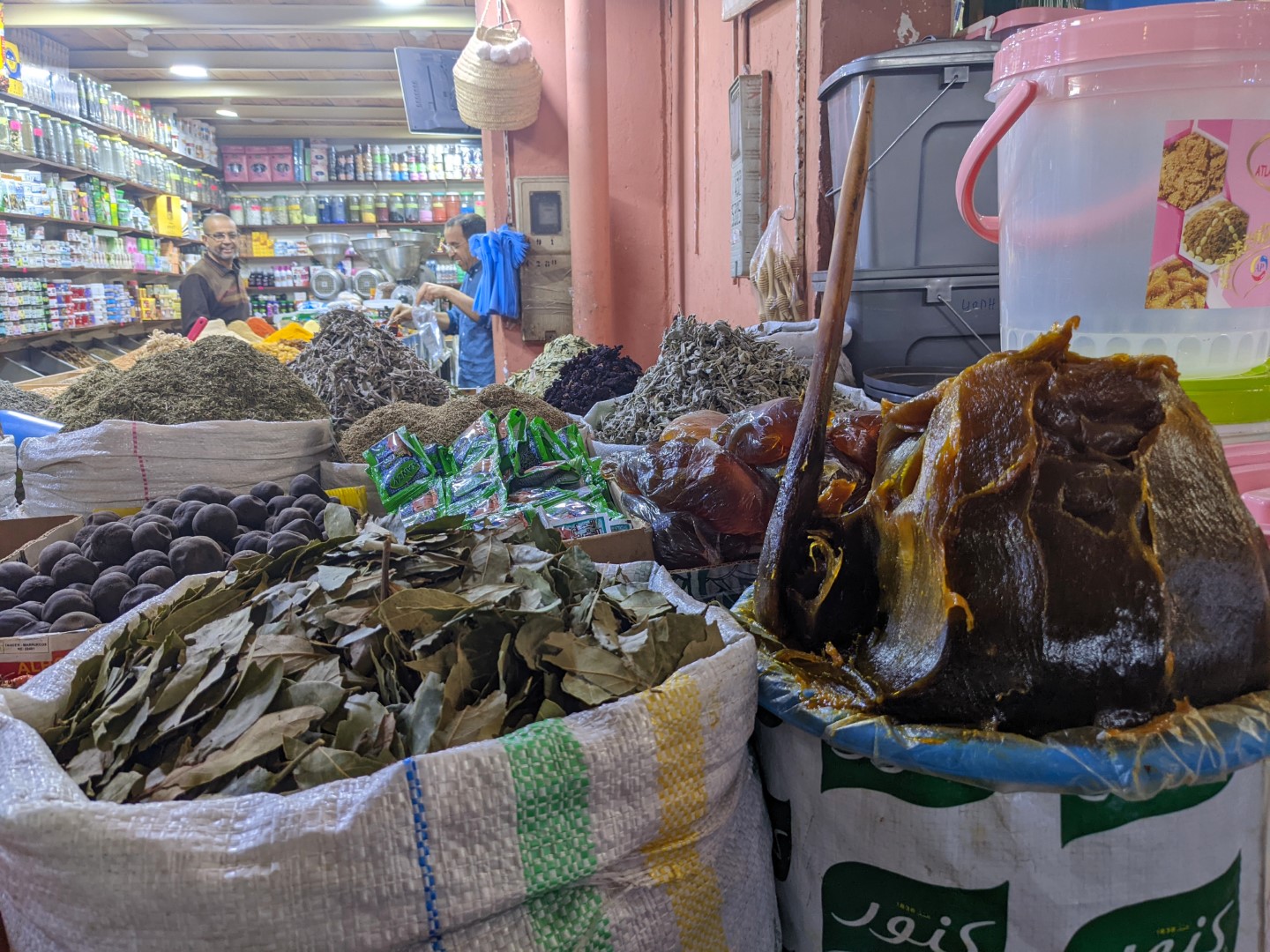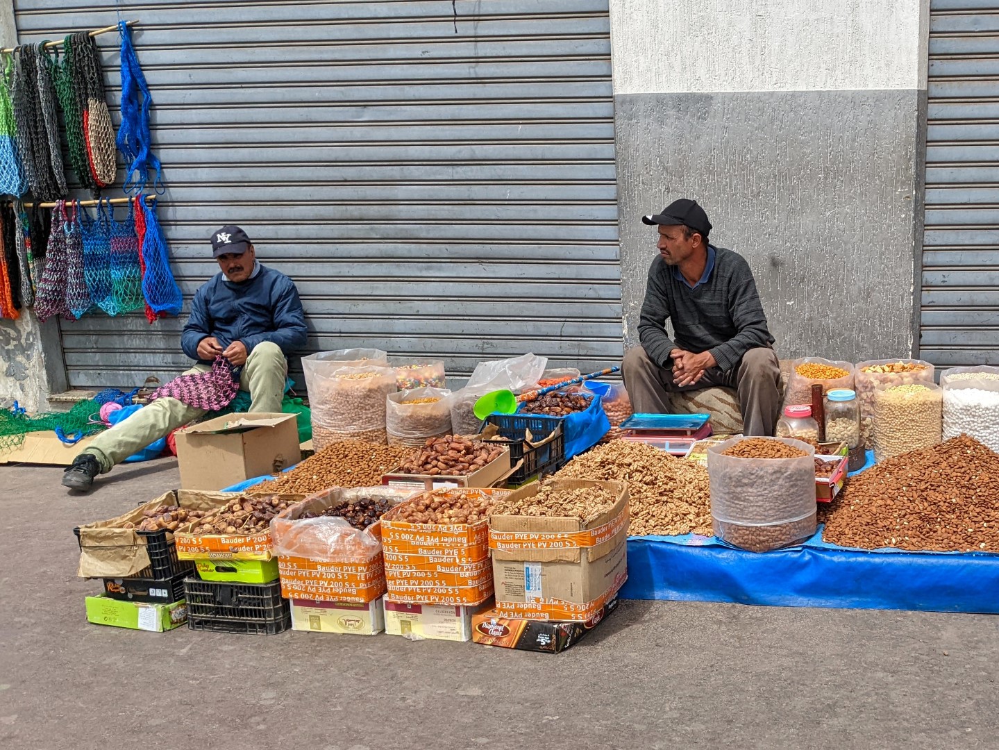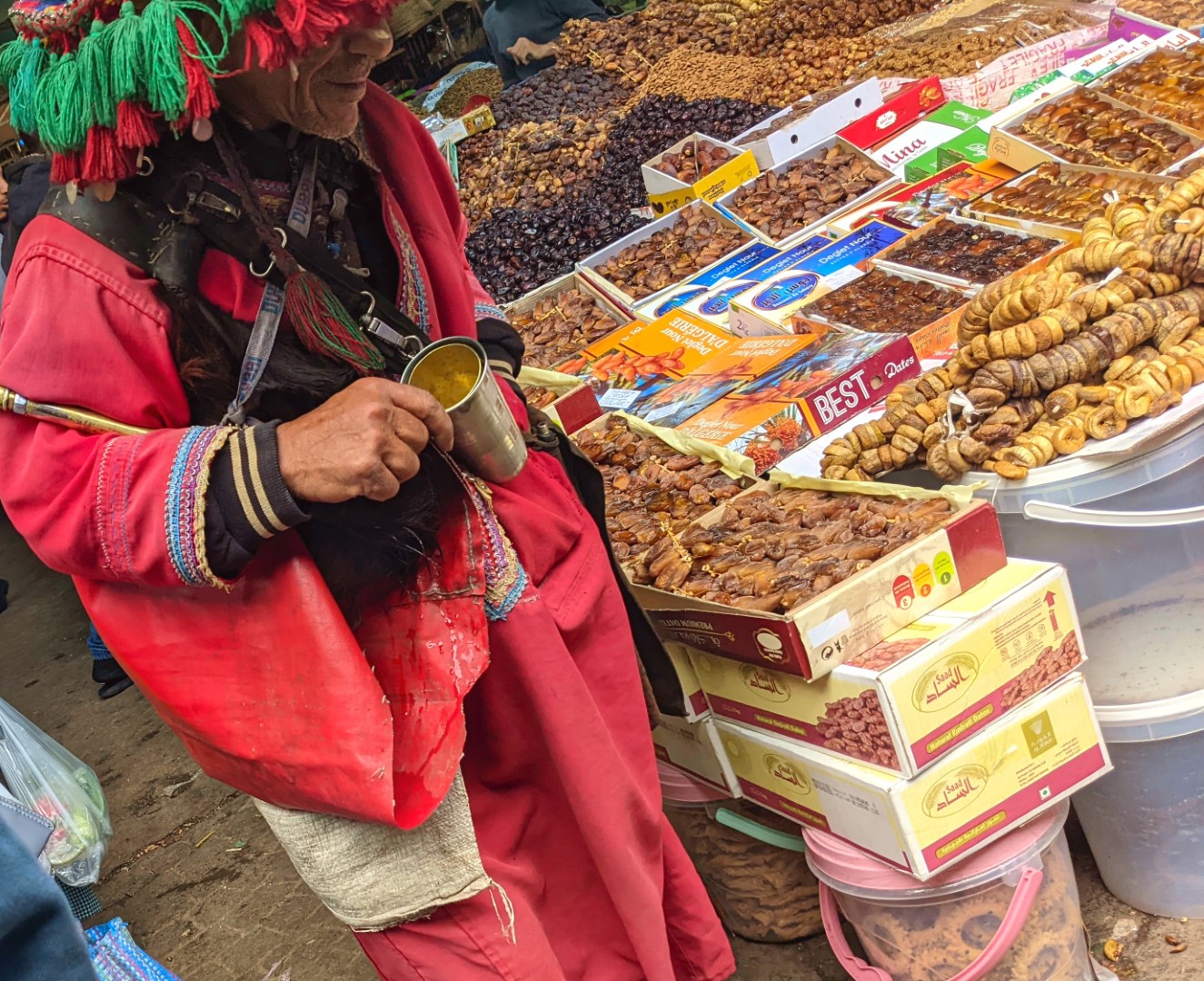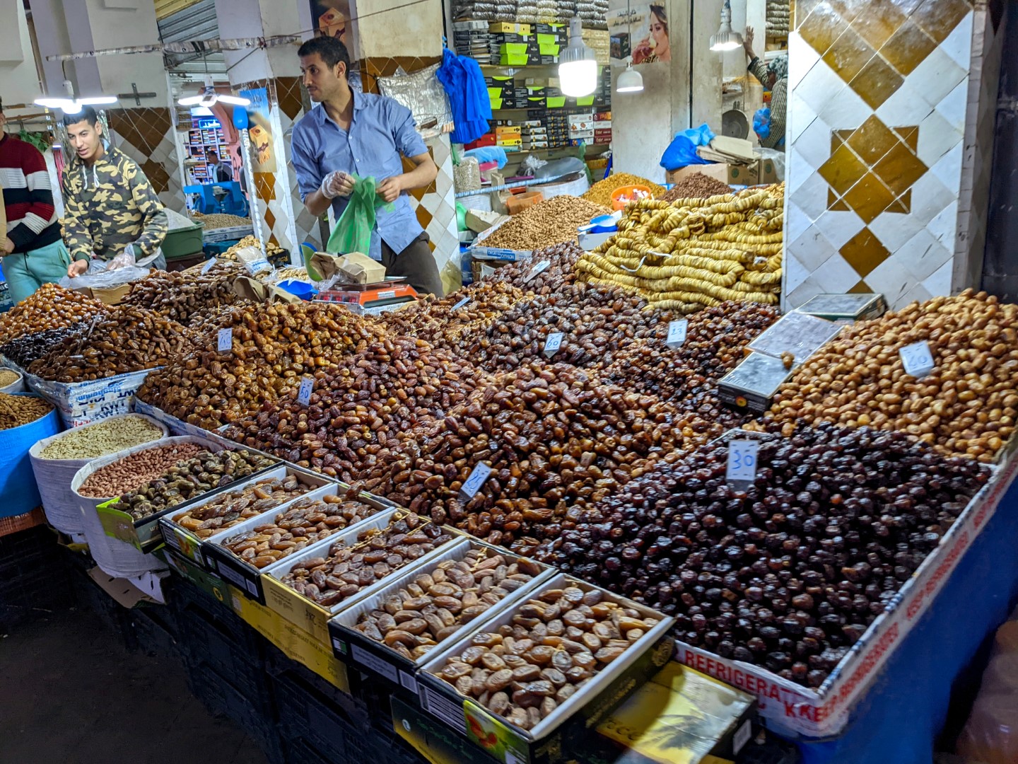 One stall we stopped at sold nuts, which are a staple of our diet. So we asked for a kilo each of almonds and walnuts. When they were bagged, we were informed that the price would be 200 dirhams. Now a dirham is about 10 cents, so that was 20 bucks for 4.4 pounds of nuts – about $4.55 a pound. Back in the States, that would be an acceptable deal, but considering how cheap things are in Morocco – and especially in a souq – it was outrageous. So we started to leave without our goods, which led to the vendor then eagerly haggling with us. We got him down to 80 dirhams, which was $1.80 a pound. That sounded much more reasonable, so we bought. But later, we learned that we were still overcharged.