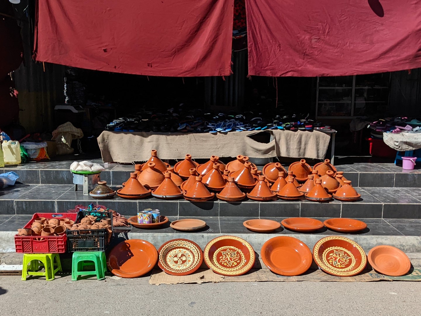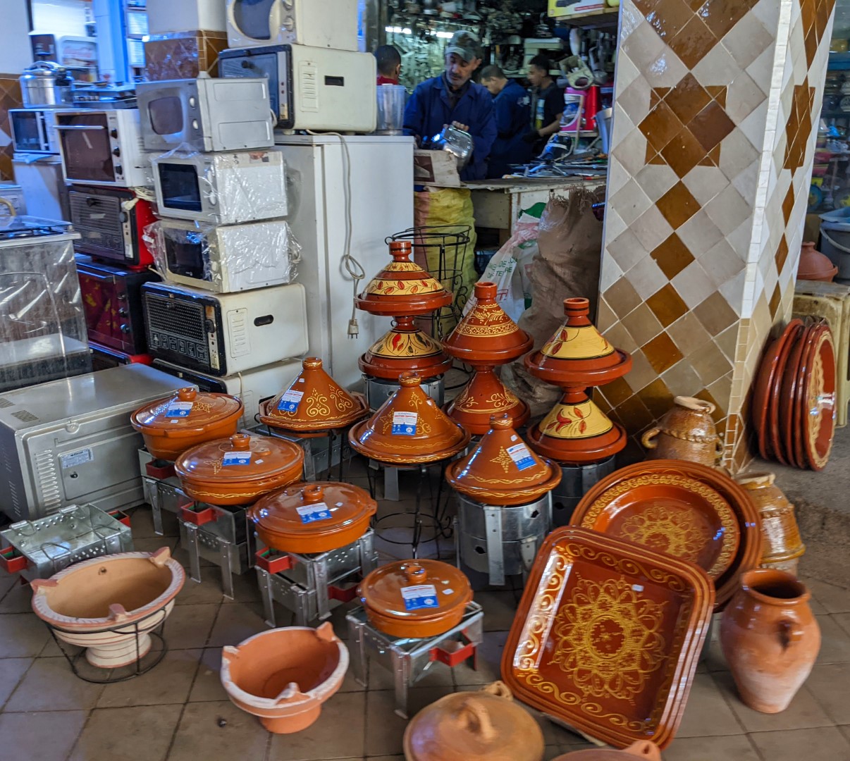 That night, Rachid cooked enough dinner to share with us, but he didn’t realize we were vegetarians. So we had to decline his offer to partake of his meal, which contained a generous portion of meat. He had made a tajine, one of many varieties of meal cooked with a cooking pot of the same name. The vessel is made from clay and consists of a platter on which the ingredients are placed, and a conical lid with a small hole in the tip that traps the heat. We’ve been seeing these for sale in various sizes all over town, looking like little traffic cones; they’re very popular in Morocco.