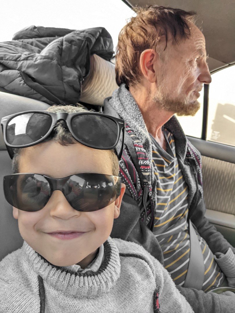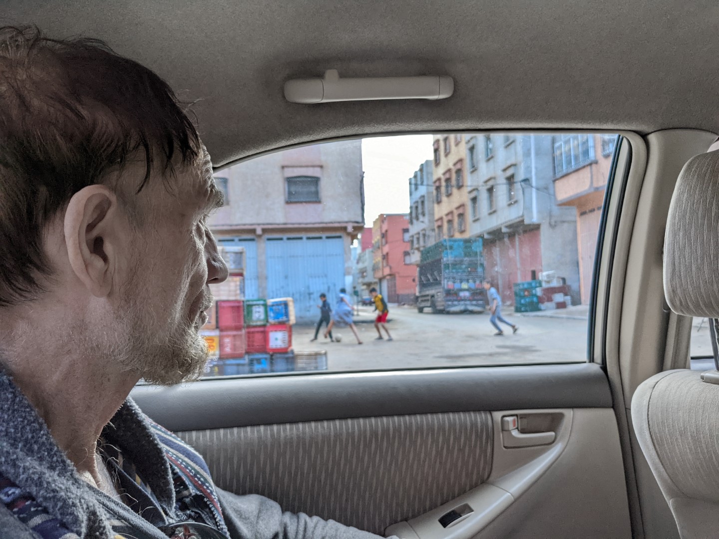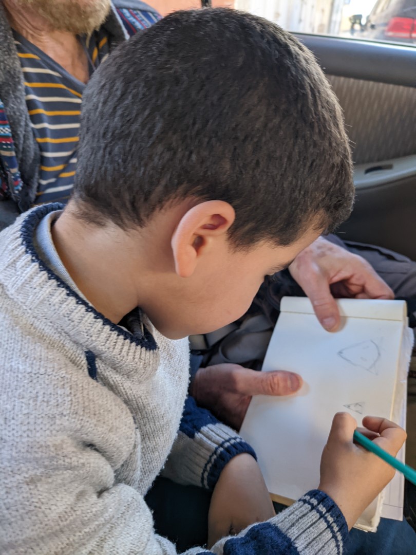 Then back to the house, where we had lunch and waited for our ride. At last they came: Mohamed (the director of the school where we’d be teaching) with his wife and two sons, ages 5 and 2. We rode in the back with the older boy; both kids were delightful though a bit rambunctious, and took up with us right away. At one point, Kimberly passed Dennis a note saying “I get the feeling that we’re expected to be fulltime babysitters.” This, prognostication, it turned out, was not far off the mark.