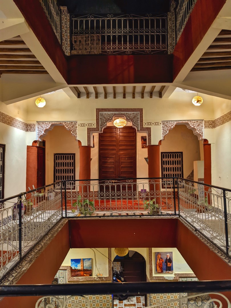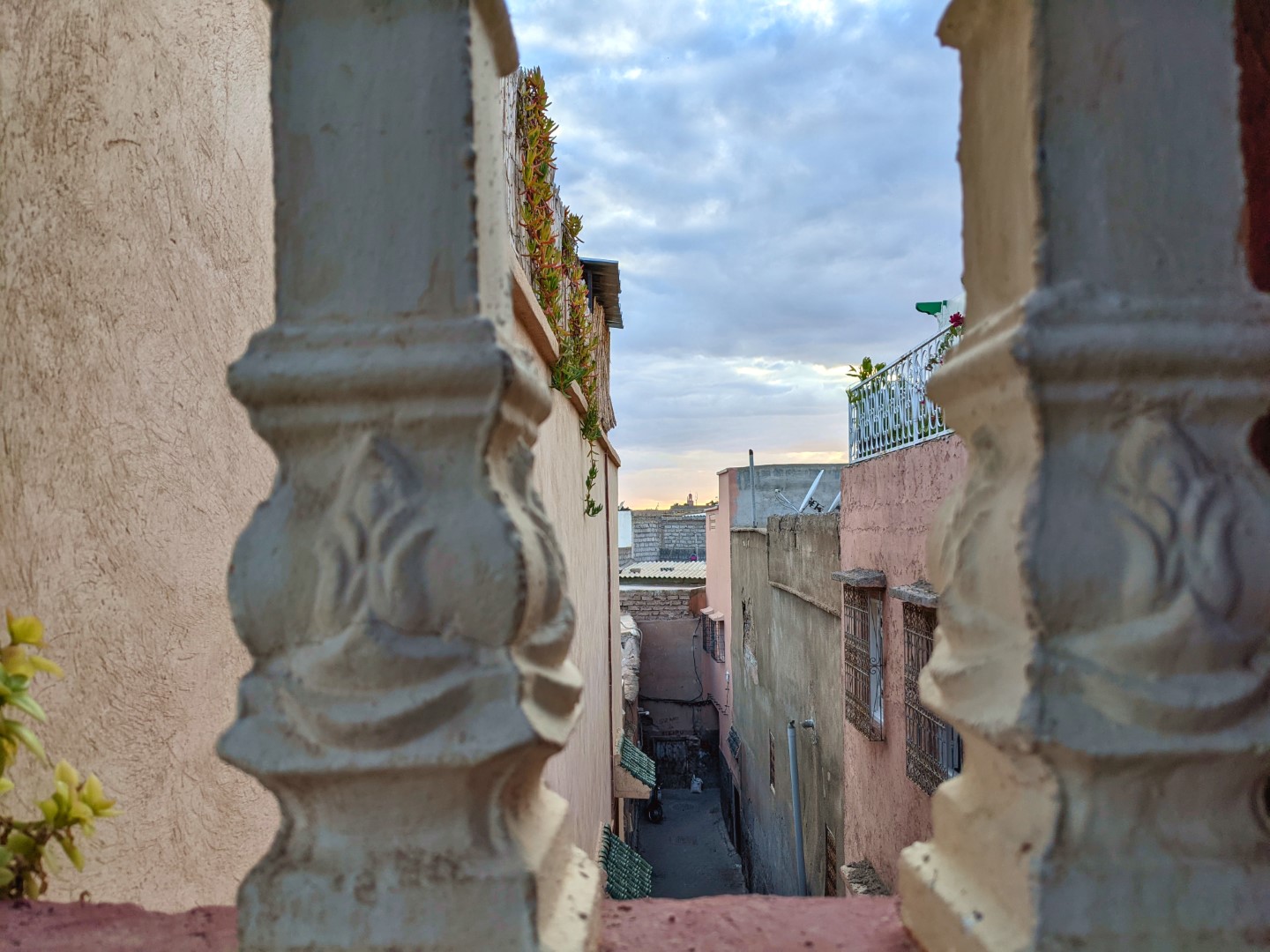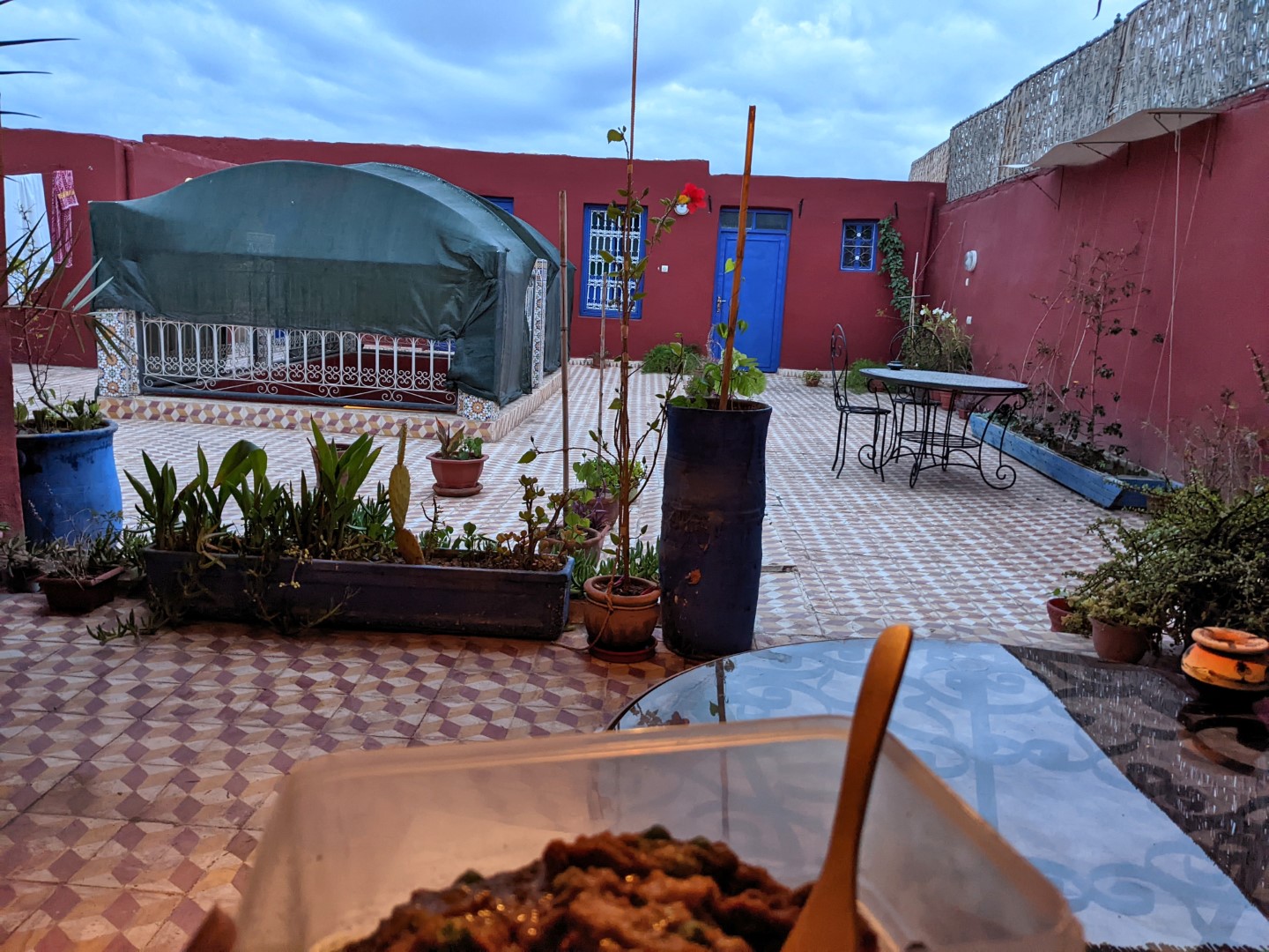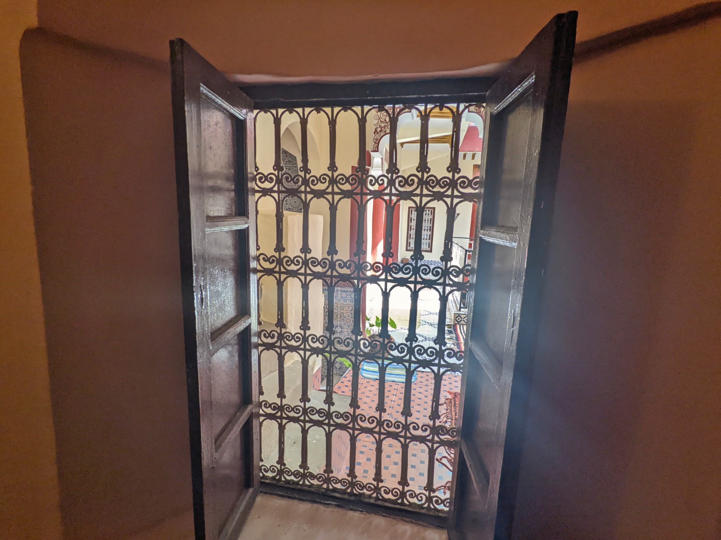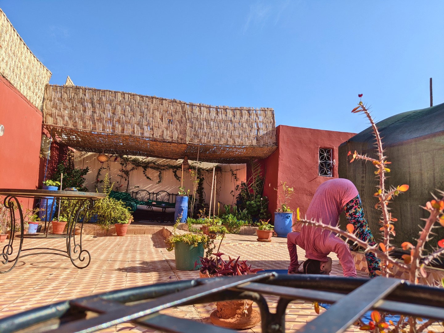 The place where we were staying, booked through Airbnb, was also an antique gem. It was a riad, a building constructed originally as a spacious home, with rooms on several floors around an open-air center. The ground floor, which was living room, dining room and courtyard, also had a kitchen that we were able to use. And there was a rooftop where we could hang our laundry and indulge in yoga and kung fu.