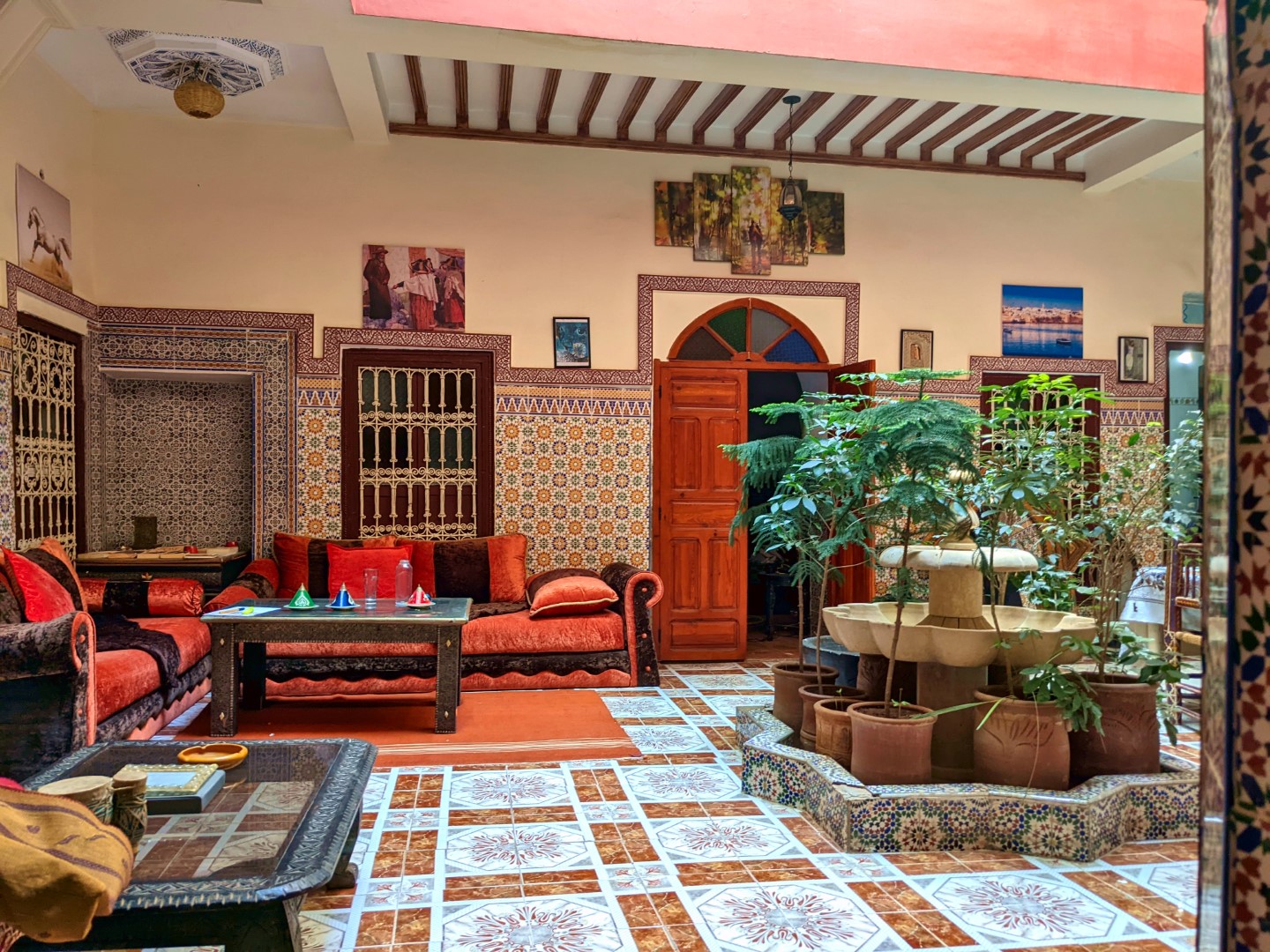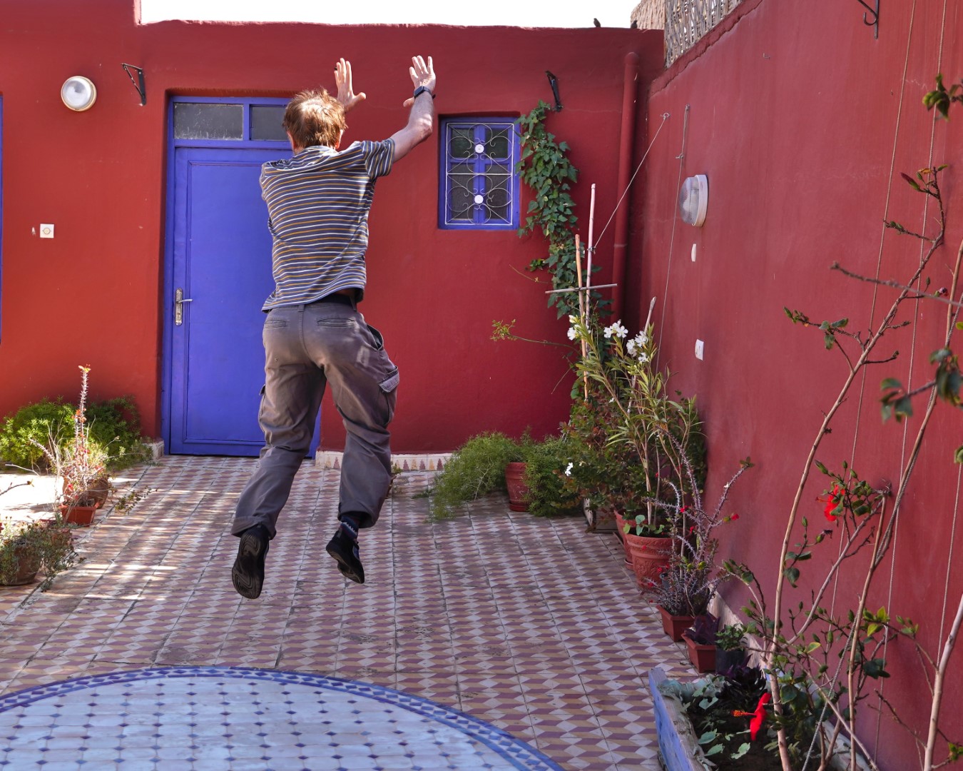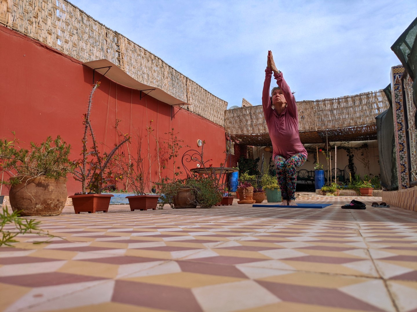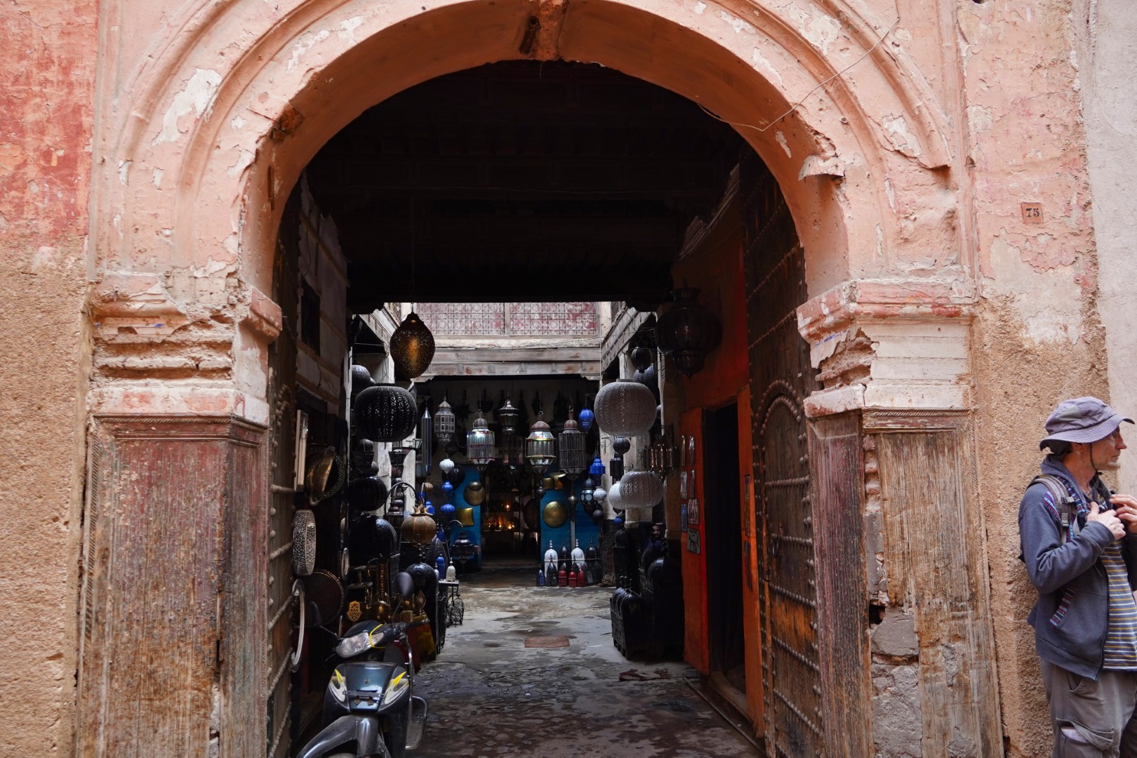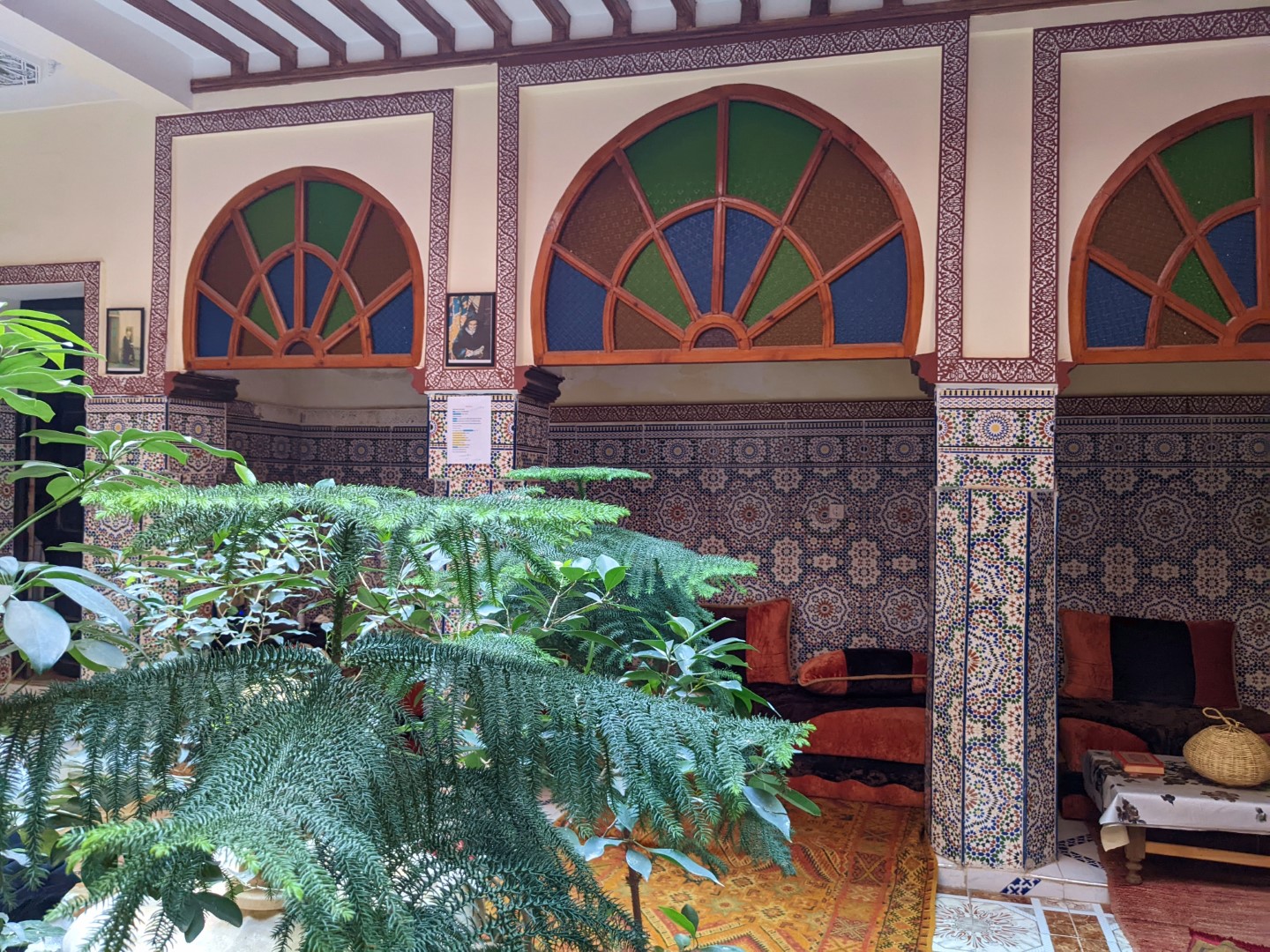 The place where we were staying, booked through Airbnb, was also an antique gem. It was a riad, a building constructed originally as a spacious home, with rooms on several floors around an open-air center. The ground floor, which was living room, dining room and courtyard, also had a kitchen that we were able to use. And there was a rooftop where we could hang our laundry and indulge in yoga and kung fu.