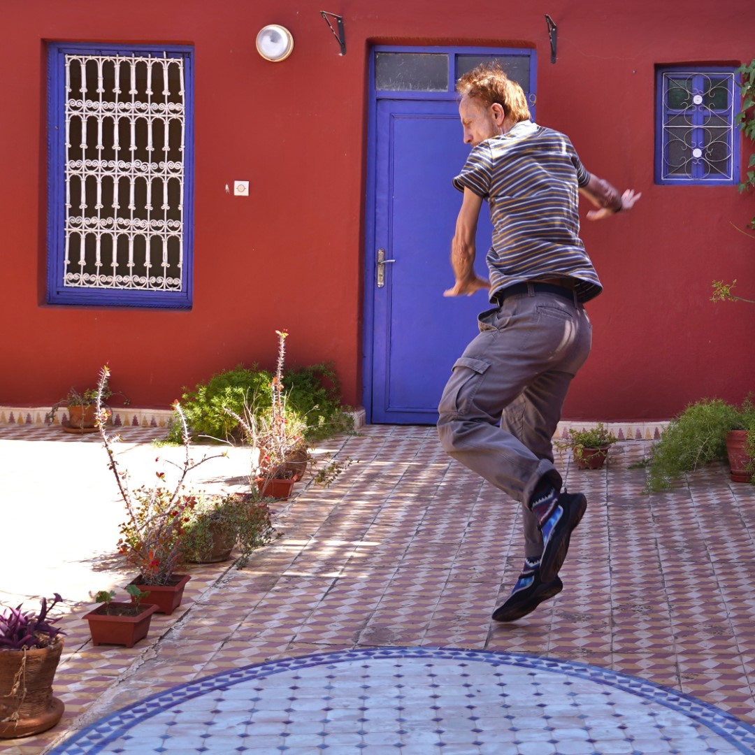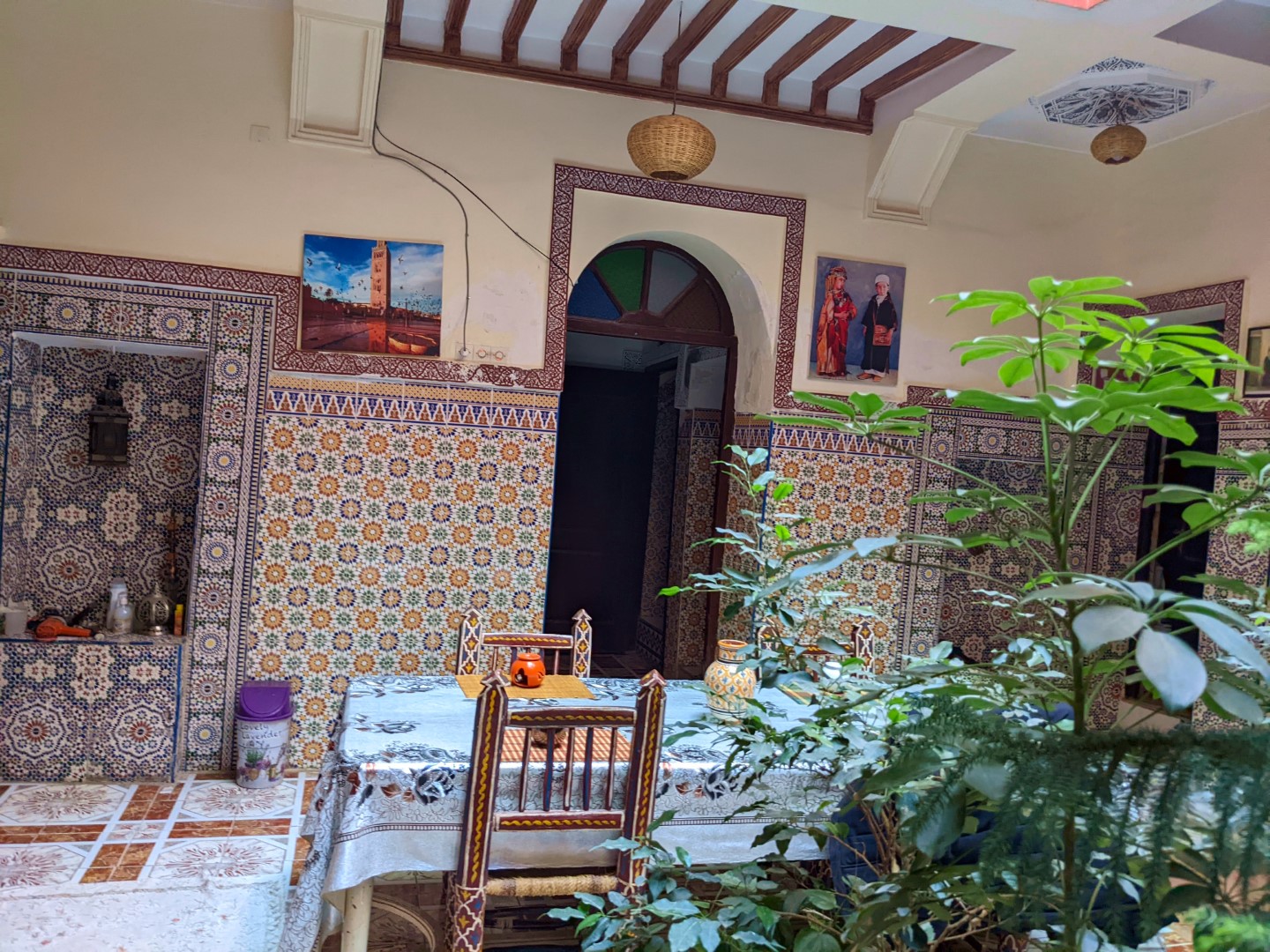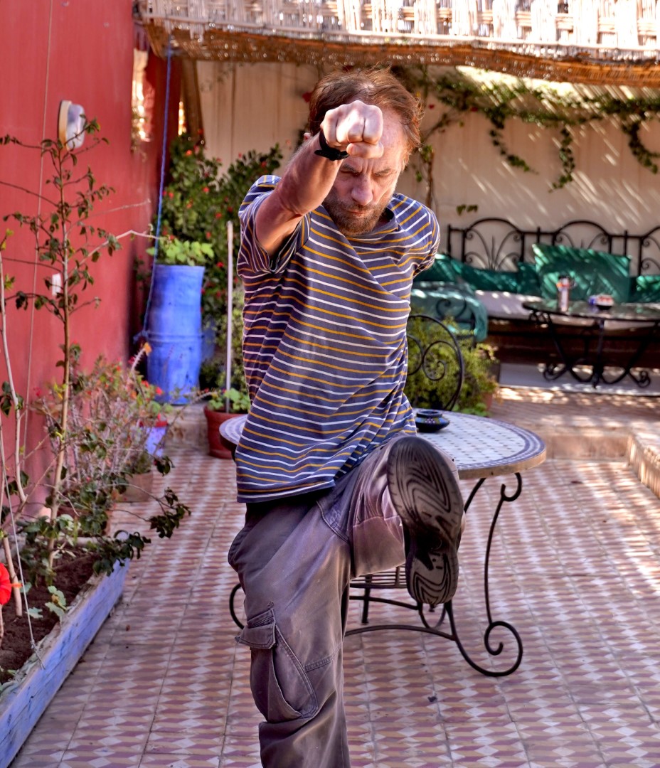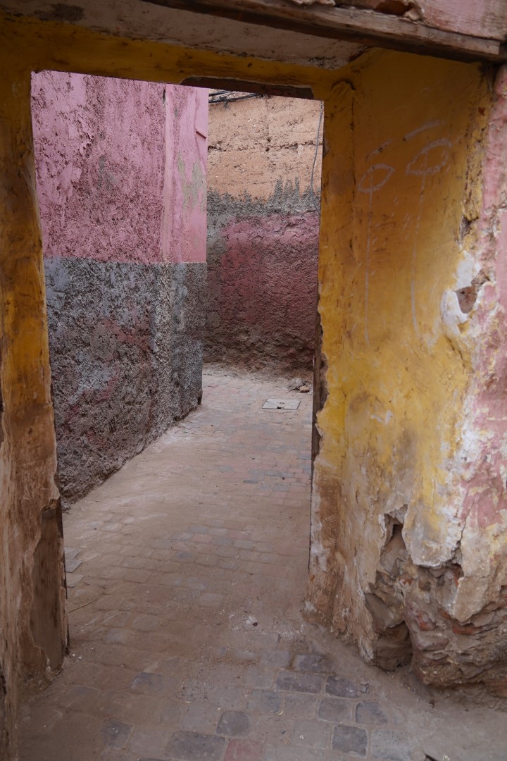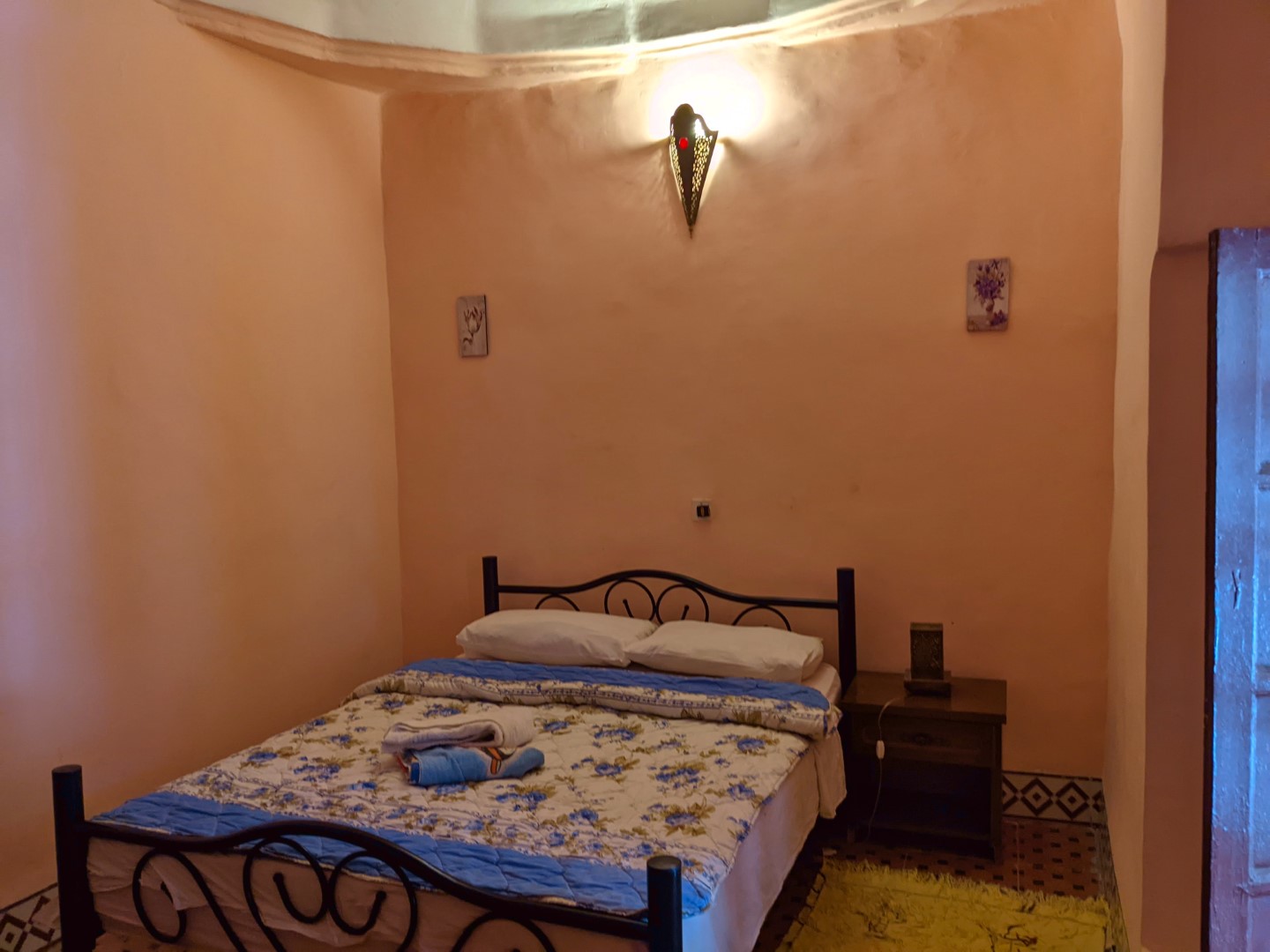 The place where we were staying, booked through Airbnb, was also an antique gem. It was a riad, a building constructed originally as a spacious home, with rooms on several floors around an open-air center. The ground floor, which was living room, dining room and courtyard, also had a kitchen that we were able to use. And there was a rooftop where we could hang our laundry and indulge in yoga and kung fu.