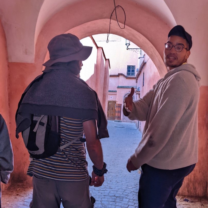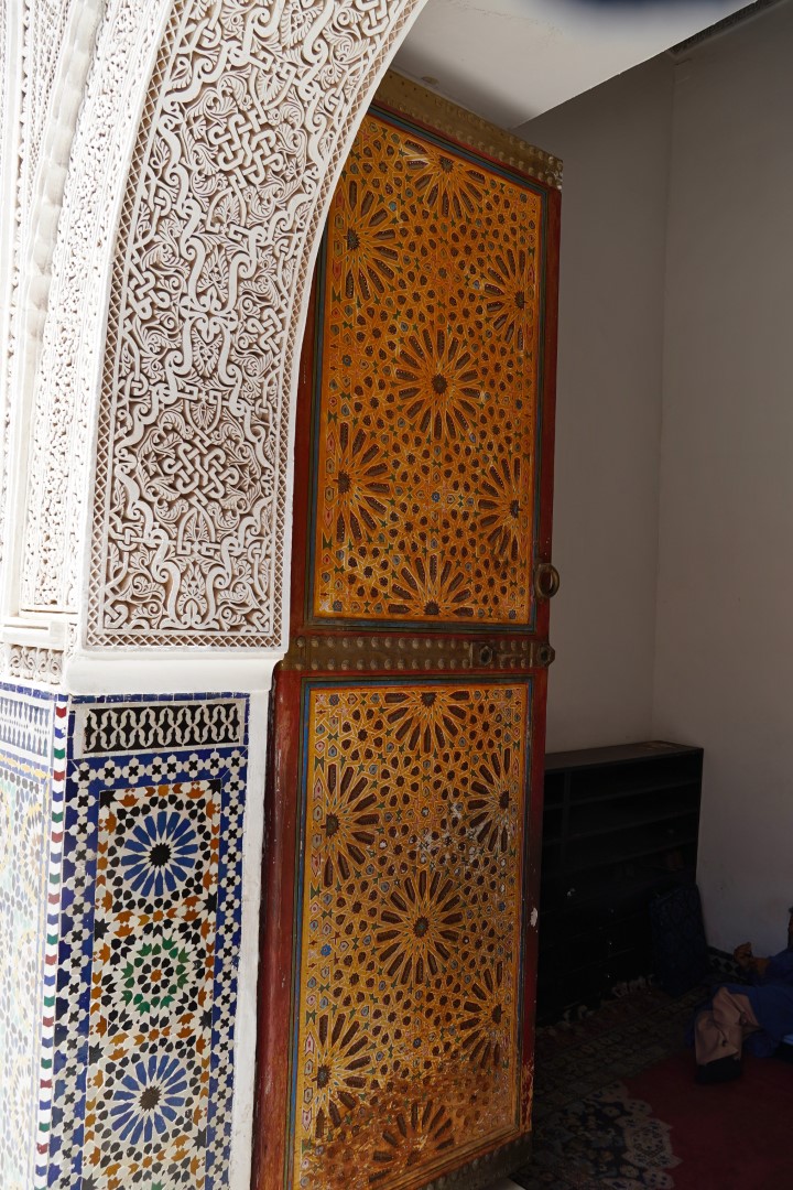 As we were reading the plaques, another smooth-talking fellow who spoke good English approached us and struck up a conversation. He introduced himself as Ali, and claimed to be a student (a popular claim, we’ve learned, for hustlers who are youngish-looking). He began telling us some things about the mosque, giving the impression that he had some connection to it. Then he invited us to drop into a nearby “Berber center”, which was open “only today”. Since we’d been intrigued by what glimpses of Berber culture we’d already been privy to, we decided to take him up on it. As we were leaving, he made a comment to a friend of his nearby (who presumably was also working the crowd), and we heard him say the magic word “American”.