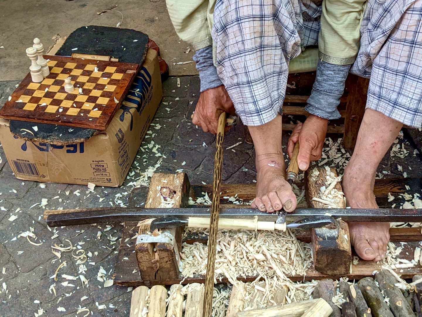 Once, while strolling past the stalls in the narrow alleys/ streets in our neighborhood, we passed a man who was practicing the most fascinating craft of hand-carving chess pieces. Or maybe we should say foot-carving them. He cranked a rudimentary lathe with his foot, turning a piece of wood which he shaped with a chisel he held in his hand. We stood watching him from a few feet away, and Kimberly pulled out her camera and waited for an opportune moment to sneak in a candid shot or two. But he motioned for her to step forward, and take all the photos she wanted.